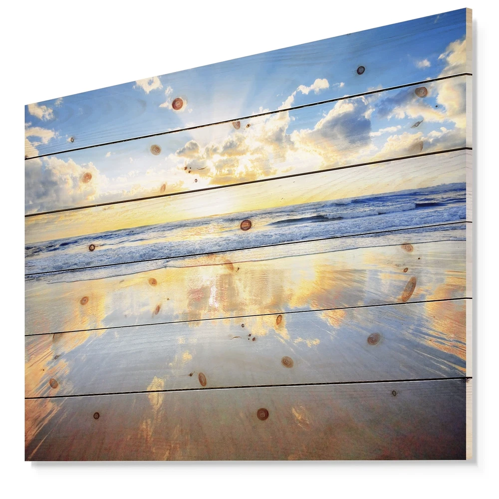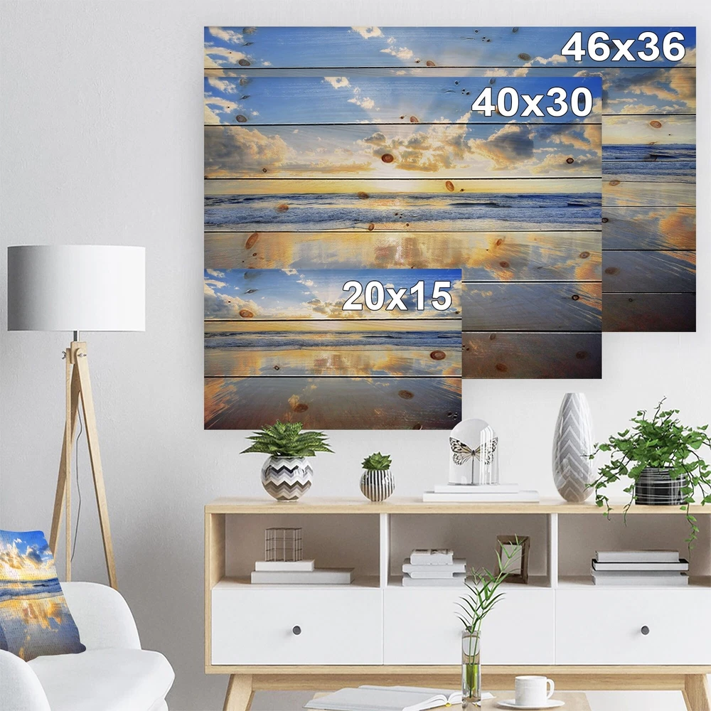 Alas, a modern take on wood wall art. Once typically a wall art piece found only in rustic or farmhouse style decor settings, this Sea & Shore wood wall art will easily fit into even the most contemporary of designs.Using the highest quality 6 Color Canon UV Ink, this Nautical & Coastal wood wall art incorporates several aspects of fine design into one stunning piece. With its slightly visible wood grain appearing through the colors and sleekly finished edges, it is a wonderful choice for any room in your home or office, being it a traditional or modern space. As each piece of wood has natural grain differences from the next, each of these wood wall arts is a truly unique addition to your space.Each Wood wall art is 100% handmade in Canada on Natural pine wood, using the highest quality Free Shipping Over $49.99* Details Designart 'Blue Sky and Clouds Mirrored in Sea' Seashore Print on Natural Pine Product Description: Alas, a modern take on wood wall art. Once typically a wall art piece found only in rustic or farmhouse style decor settings, this Sea & Shore wood wall art will easily fit into even the most contemporary of designs. Using the highest quality 6 Color Canon UV Ink, this Nautical & Coastal wood wall art incorporates several aspects of fine design into one stunning piece. With its slightly visible wood grain appearing through the colors and sleekly finished edges, it is a wonderful choice for any room in your home or office, being it a traditional or modern space. As each piece of wood has natural grain differences from the next, each of these wood wall arts is a truly unique addition to your space. Each Wood wall art is 100% handmade in Canada on Natural pine wood, using the highest quality ink which will not fade over time. Available in 3 Differents sizes 20x15, 40x30, 46x36 - OrientationHorizontal - SubjectSea & Shore TypeWood Wall Art, Fine Art, Wood Fine Art, Print on Plaque - Arrives ready to hang on the wall with hanging kit included - MaterialMade with 100% natural pine wood - StyleNautical & Coastal- Number of Pieces1 - SizeMedium, Large, Small - ColorBlue