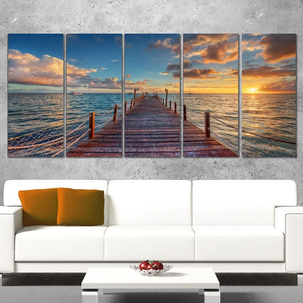 Transport yourself to the beach and consider the horizon at any time with this 'Brilliant Sunrise Over Sea Pier' wall art. Resembling fine art photography, this series of panels are actually high-grad ink applied to durable canvas. The canvas is stretched taut over a wood sub-frame and gallery-wrapped for immediate display.Shape: RectangleOrientation: HorizontalSubject: Photography, Architecture, CityscapesStyle: Contemporary, Fine Art Giclee, ModernSize: Oversized Free Shipping Over $49.99* Details Designart "Brilliant Sunrise over Sea Pier" Modern Bridge 60 in. wide x 32 in. Product Description: Transport yourself to the beach and consider the horizon at any time with this 'Brilliant Sunrise Over Sea Pier' wall art. Resembling fine art photography, this series of panels are actually high-grad ink applied to durable canvas. The canvas is stretched taut over a wood sub-frame and gallery-wrapped for immediate display. ShapeRectangle OrientationHorizontal SubjectPhotography, Architecture, Cityscapes StyleContemporary, Fine Art Giclee, Modern SizeOversized