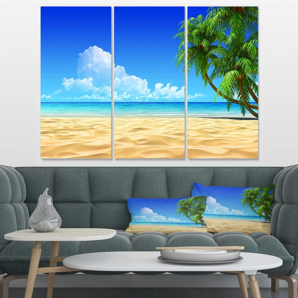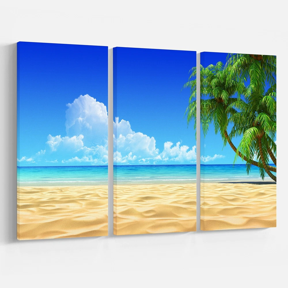 This beautiful Sea & Shore Canvas Art is printed using the highest quality fade resistant ink on canvas. Every one of our fine art giclee canvas prints is printed on premium quality cotton canvas, using the finest quality inks which will not fade over time. Each giclee print is stretched tightly over a 1 inch wood sub frame ensuring the canvas is taught and does not buckle. This canvas art print is gallery-wrapped (the design continues on the sides) , giving it a real art gallery feel. All of our canvas prints are carefully packaged with plastic protection, fragile labeling and sturdy boxes to ensure a safe delivery. Every canvas print arrives ready to hang on the wall, with the hanging kits included.- Style : Nautical & Coastal- Subject : Sea & Shore, Nautical- Color : Blue- This canvas Free Shipping Over $49.99* Details Designart "Coconut Palms Bent into Beach" Seashore Canvas Art Print - 36x28 - 3 Product Description: This beautiful Sea & Shore Canvas Art is printed using the highest quality fade resistant ink on canvas. Every one of our fine art giclee canvas prints is printed on premium quality cotton canvas, using the finest quality inks which will not fade over time. Each giclee print is stretched tightly over a 1 inch wood sub frame ensuring the canvas is taught and does not buckle. This canvas art print is gallery-wrapped (the design continues on the sides) , giving it a real art gallery feel. All of our canvas prints are carefully packaged with plastic protection, fragile labeling and sturdy boxes to ensure a safe delivery. Every canvas print arrives ready to hang on the wall, with the hanging kits included. - Style Nautical & Coastal - Subject Sea & Shore, Nautical - Color Blue - This canvas giclee print is gallery-wrapped (the design continues on the sides) , giving it a real art gallery feel. - Premium quality cotton canvas. - Arrives ready to hang on the wall - Easy to Hang