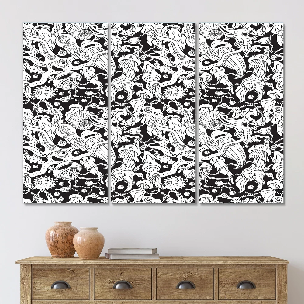 This beautiful Deep Sea Monsters In Black And White Multipanels canvas art is printed using the highest quality fade-resistant ink on canvas. Every one of our fine art giclee canvas prints is printed on premium quality cotton canvas, using the finest quality inks which will not fade over time. Each giclee print is stretched tightly over a 1-inch wood subframe ensuring the canvas is taught and does not buckle. This canvas art print is gallery-wrapped (the design continues on the sides), giving it a real art gallery feel. All of our canvas prints are carefully packaged with plastic protection, fragile labeling, and sturdy boxes to ensure safe delivery. Every canvas print arrives ready to hang on the wall, with the hanging kits included.- Style : Patterned- Subject : Animals, Abstract- Color Free Shipping Over $49.99* Details Designart "Deep Sea Monsters In Black And White" Patterned Canvas Wall Art Print Product Description: This beautiful Deep Sea Monsters In Black And White Multipanels canvas art is printed using the highest quality fade-resistant ink on canvas. Every one of our fine art giclee canvas prints is printed on premium quality cotton canvas, using the finest quality inks which will not fade over time. Each giclee print is stretched tightly over a 1-inch wood subframe ensuring the canvas is taught and does not buckle. This canvas art print is gallery-wrapped (the design continues on the sides), giving it a real art gallery feel. All of our canvas prints are carefully packaged with plastic protection, fragile labeling, and sturdy boxes to ensure safe delivery. Every canvas print arrives ready to hang on the wall, with the hanging kits included. - Style Patterned - Subject Animals, Abstract - Color Black - This canvas giclee print is gallery-wrapped (the design continues on the sides) , giving it a real art gallery feel. - Premium quality cotton canvas. - Arrives ready to hang on the wall - Easy to Hang