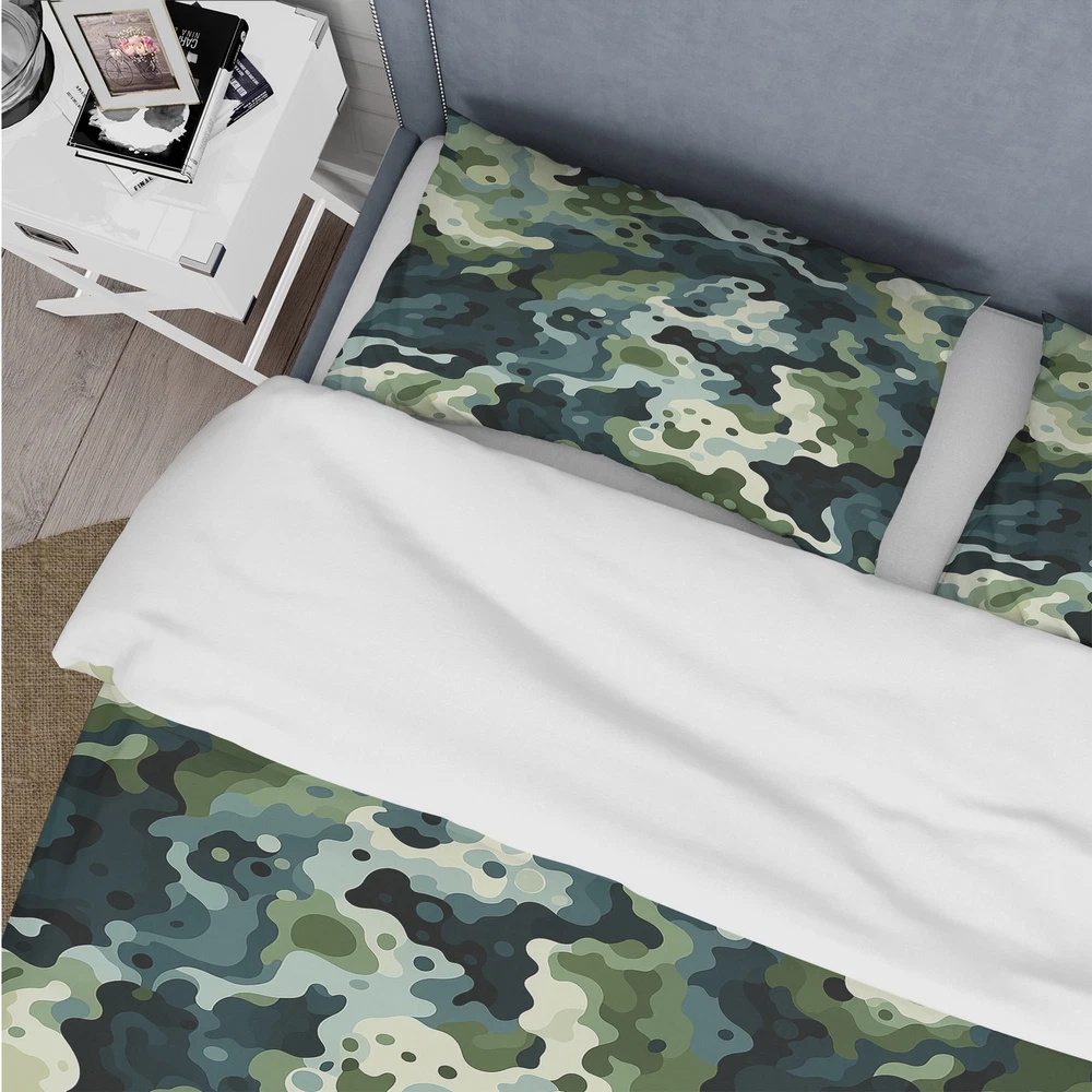 There is just nothing better than a beautiful, inviting comfortable bed after a long day. This Camouflage bed set is created using the richest colors stemming from high density Italian ink and the softest fabrics making it the perfect way to spruce up your bedroom, while keeping it ultra-comfortable. This luxurious Lush Camouflage Jungle I bed design is made with 100% microfiber polyester, making it ultra-soft to ensure you sleep comfortably all night long. This Modern & Contemporary set includes 1 Bed Cover and 2 Shams and is available in twin, queen and king sizes.This Bedding Set is easily integrated into your already decorated space.What's Included? - Duvet Cover - Shams - Pillow Cases not included but can be buy separately - Comforter Insert NOT INCLUDEDFeatures - Free Shipping Over $49.99* Details Designart "Lush Camouflage Jungle I" Modern Bedding Covert Cet With 2 Shams Product Description: There is just nothing better than a beautiful, inviting comfortable bed after a long day. This Camouflage bed set is created using the richest colors stemming from high density Italian ink and the softest fabrics making it the perfect way to spruce up your bedroom, while keeping it ultra-comfortable. This luxurious Lush Camouflage Jungle I bed design is made with 100% microfiber polyester, making it ultra-soft to ensure you sleep comfortably all night long. This Modern & Contemporary set includes 1 Bed Cover and 2 Shams and is available in twin, queen and king sizes. This Bedding Set is easily integrated into your already decorated space. What's Included? - Duvet Cover - Shams - Pillow Cases not included but can be buy separately - Comforter Insert NOT INCLUDED Features - Printed using High Density Italian Ink making the colors extra vibrant. - Made from ultra-soft, lightweight 100% microfiber polyester. Wrinkle resistant fabric. Down-like comfort, odorless. - The Modern & Contemporary bed set includes one bed cover and two standard pillow shams to create a complete and stylish look. - The elegant and soft colors are both trendy and fun to brighten and update your bedroom. - Made in Canada - Decorative Wall Art and throw pillows to match this set are available but sold separately. - Actual comforter inserts and pillow inserts are not included. This set includes the two pillow shams and comforter cover only. King Dimensions: - 1 Duvet Cover104 inches wide x 88 inches long - 2 King Shams20 inches wide x 36 inches long Queen Dimensions: - 1 Duvet Cover88 inches wide x 88 inches long - 2 Standard Shams16 inches wide x 26 inches long Twin Dimensions: - 1 Duvet Cover68 inches wide x 88 inches long - 1 Standard Sham16 inches wide x 26 inches long Product Details - MaterialPolyester. - PatternCamouflage - ColorGreen - StyleModern & Contemporary - ReversibleNo Directions: Fabric Care InstructionsMachine wash on cold gentle cycle. Wash separately on first wash. Use only non- chlorine bleach when needed. Tumble dry low. Remove promptly.