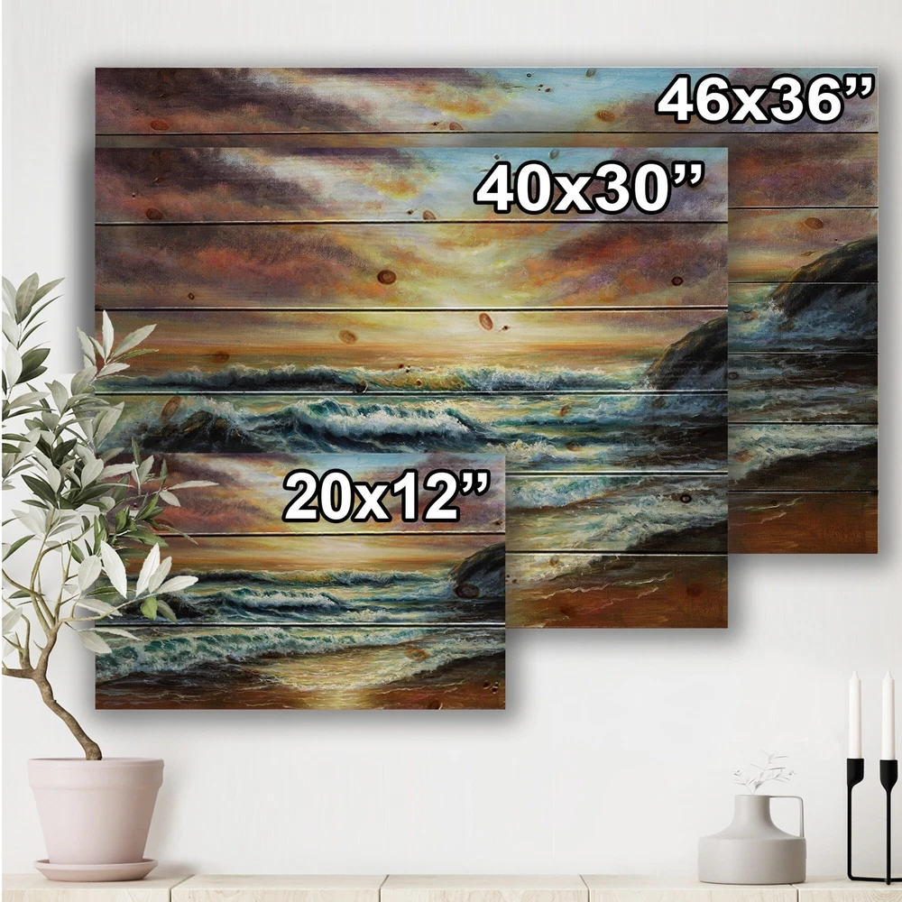 Alas, a modern take on wood wall art. Once typically a wall art piece found only in rustic or farmhouse style decor settings, this Beach wood wall art will easily fit into even the most contemporary of designs.Using the highest quality 6 Color Canon UV Ink, this Nautical & Coastal wood wall art incorporates several aspects of fine design into one stunning piece. With its slightly visible wood grain appearing through the colors and sleekly finished edges, it is a wonderful choice for any room in your home or office, being it a traditional or modern space. As each piece of wood has natural grain differences from the next, each of these wood wall arts is a truly unique addition to your space.Each Wood wall art is 100% handmade in Canada on Natural pine wood, using the highest quality ink Free Shipping Over $49.99* Details Designart 'Magnificent Sunset Over Blue Wild Wave Ocean' Nautical & Coastal Product Description: Alas, a modern take on wood wall art. Once typically a wall art piece found only in rustic or farmhouse style decor settings, this Beach wood wall art will easily fit into even the most contemporary of designs. Using the highest quality 6 Color Canon UV Ink, this Nautical & Coastal wood wall art incorporates several aspects of fine design into one stunning piece. With its slightly visible wood grain appearing through the colors and sleekly finished edges, it is a wonderful choice for any room in your home or office, being it a traditional or modern space. As each piece of wood has natural grain differences from the next, each of these wood wall arts is a truly unique addition to your space. Each Wood wall art is 100% handmade in Canada on Natural pine wood, using the highest quality ink which will not fade over time. Available in Differents sizes - OrientationHorizontal - SubjectBeach TypeWood Wall Art, Fine Art, Wood Fine Art, Print on Plaque - Arrives ready to hang on the wall with hanging kit included - MaterialMade with 100% natural pine wood - StyleNautical & Coastal - Number of Pieces1 - ColorBlue