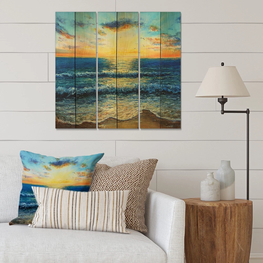 Alas, a modern take on wood wall art. Once typically a wall art piece found only in rustic or farmhouse style decor settings, this Beach wood wall art will easily fit into even the most contemporary of designs.Using the highest quality 6 Color Canon UV Ink, this Nautical & Coastal wood wall art incorporates several aspects of fine design into one stunning piece. With its slightly visible wood grain appearing through the colors and sleekly finished edges, it is a wonderful choice for any room in your home or office, being it a traditional or modern space. As each piece of wood has natural grain differences from the next, each of these wood wall arts is a truly unique addition to your space.Each Wood wall art is 100% handmade in Canada on Natural pine wood, using the highest quality ink Free Shipping Over $49.99* Details Designart 'Morning Light On The Ocean Waves I' Nautical & Coastal Print on Product Description: Alas, a modern take on wood wall art. Once typically a wall art piece found only in rustic or farmhouse style decor settings, this Beach wood wall art will easily fit into even the most contemporary of designs. Using the highest quality 6 Color Canon UV Ink, this Nautical & Coastal wood wall art incorporates several aspects of fine design into one stunning piece. With its slightly visible wood grain appearing through the colors and sleekly finished edges, it is a wonderful choice for any room in your home or office, being it a traditional or modern space. As each piece of wood has natural grain differences from the next, each of these wood wall arts is a truly unique addition to your space. Each Wood wall art is 100% handmade in Canada on Natural pine wood, using the highest quality ink which will not fade over time. - OrientationHorizontal - SubjectBeach TypeWood Wall Art, Fine Art, Wood Fine Art, Print on Plaque - Arrives ready to hang on the wall with hanging kit included - MaterialMade with 100% natural pine wood - StyleNautical & Coastal - Number of Pieces3 - ColorBlue