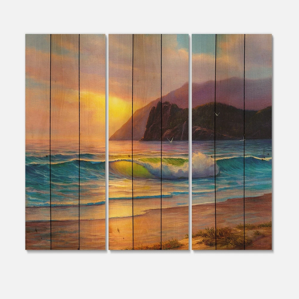 Alas, a modern take on wood wall art. Once typically a wall art piece found only in rustic or farmhouse style decor settings, this Beach wood wall art will easily fit into even the most contemporary of designs.Using the highest quality 6 Color Canon UV Ink, this Nautical & Coastal wood wall art incorporates several aspects of fine design into one stunning piece. With its slightly visible wood grain appearing through the colors and sleekly finished edges, it is a wonderful choice for any room in your home or office, being it a traditional or modern space. As each piece of wood has natural grain differences from the next, each of these wood wall arts is a truly unique addition to your space.Each Wood wall art is 100% handmade in Canada on Natural pine wood, using the highest quality ink Free Shipping Over $49.99* Details Designart 'Morning Sunlight On The Sea Waves V' Nautical & Coastal Print on Product Description: Alas, a modern take on wood wall art. Once typically a wall art piece found only in rustic or farmhouse style decor settings, this Beach wood wall art will easily fit into even the most contemporary of designs. Using the highest quality 6 Color Canon UV Ink, this Nautical & Coastal wood wall art incorporates several aspects of fine design into one stunning piece. With its slightly visible wood grain appearing through the colors and sleekly finished edges, it is a wonderful choice for any room in your home or office, being it a traditional or modern space. As each piece of wood has natural grain differences from the next, each of these wood wall arts is a truly unique addition to your space. Each Wood wall art is 100% handmade in Canada on Natural pine wood, using the highest quality ink which will not fade over time. - OrientationHorizontal - SubjectBeach TypeWood Wall Art, Fine Art, Wood Fine Art, Print on Plaque - Arrives ready to hang on the wall with hanging kit included - MaterialMade with 100% natural pine wood - StyleNautical & Coastal - Number of Pieces3 - ColorPurple