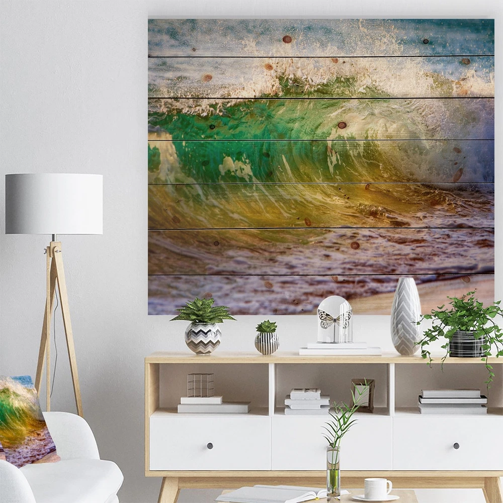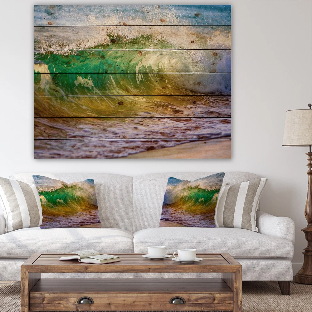 Alas, a modern take on wood wall art. Once typically a wall art piece found only in rustic or farmhouse style decor settings, this Sea & Shore wood wall art will easily fit into even the most contemporary of designs.Using the highest quality 6 Color Canon UV Ink, this Nautical & Coastal wood wall art incorporates several aspects of fine design into one stunning piece. With its slightly visible wood grain appearing through the colors and sleekly finished edges, it is a wonderful choice for any room in your home or office, being it a traditional or modern space. As each piece of wood has natural grain differences from the next, each of these wood wall arts is a truly unique addition to your space.Each Wood wall art is 100% handmade in Canada on Natural pine wood, using the highest quality Free Shipping Over $49.99* Details Designart 'Ocean Turning Green' Seascape Print on Natural Pine Wood - Green Product Description: Alas, a modern take on wood wall art. Once typically a wall art piece found only in rustic or farmhouse style decor settings, this Sea & Shore wood wall art will easily fit into even the most contemporary of designs. Using the highest quality 6 Color Canon UV Ink, this Nautical & Coastal wood wall art incorporates several aspects of fine design into one stunning piece. With its slightly visible wood grain appearing through the colors and sleekly finished edges, it is a wonderful choice for any room in your home or office, being it a traditional or modern space. As each piece of wood has natural grain differences from the next, each of these wood wall arts is a truly unique addition to your space. Each Wood wall art is 100% handmade in Canada on Natural pine wood, using the highest quality ink which will not fade over time. Available in 3 Differents sizes 20x15, 40x30, 46x36 - OrientationHorizontal - SubjectSea & Shore TypeWood Wall Art, Fine Art, Wood Fine Art, Print on Plaque - Arrives ready to hang on the wall with hanging kit included - MaterialMade with 100% natural pine wood - StyleNautical & Coastal- Number of Pieces1 - SizeMedium, Large, Small - ColorGreen