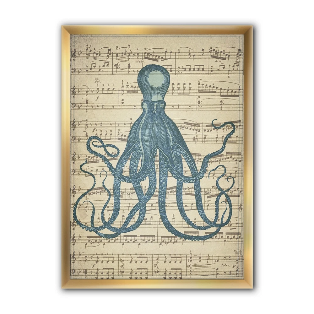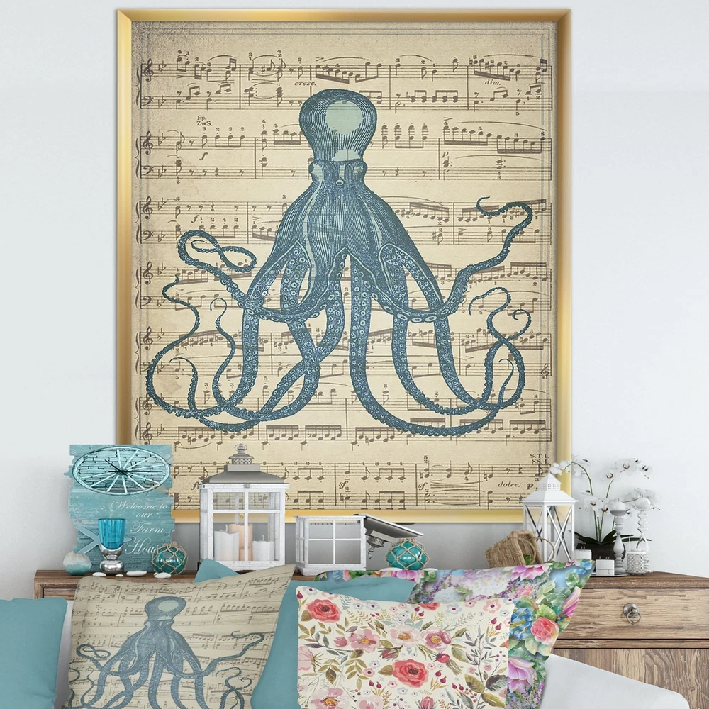 Up the nautical appeal of your home decor with the Designart 'Octopus Music Score II' premium framed art print. This unique print features a large octopus against a sheet music background, offering a great conversation starter that lends an imaginative element to your space, and the frame comes in your choice of color so you can easily match this artwork to your home decor. The premium-quality canvas is printed with fade-resistant inks to ensure longevity of display, and a hanging kit is included for your convenience.This framed art print is available in many different color frames. All of our framed art prints are carefully packaged with corner protectors, fragile labeling, and sturdy boxes to ensure a safe delivery. Every framed art arrives ready to hang on the wall, with the hanging kit Free Shipping Over $49.99* Details Designart "Octopus Music Score II" Nautical & Coastal Premium Framed Art Print Product Description: Up the nautical appeal of your home decor with the Designart 'Octopus Music Score II' premium framed art print. This unique print features a large octopus against a sheet music background, offering a great conversation starter that lends an imaginative element to your space, and the frame comes in your choice of color so you can easily match this artwork to your home decor. The premium-quality canvas is printed with fade-resistant inks to ensure longevity of display, and a hanging kit is included for your convenience. This framed art print is available in many different color frames. All of our framed art prints are carefully packaged with corner protectors, fragile labeling, and sturdy boxes to ensure a safe delivery. Every framed art arrives ready to hang on the wall, with the hanging kit included. Features: Style Traditional Subject Animals Color Blue Premium quality cotton canvas mounted. Available in several frame colors. Arrives with instructions and hanging kit