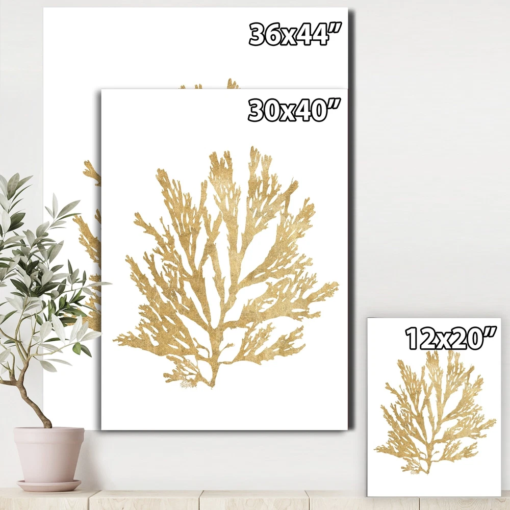 This beautiful Cottage Canvas Art is printed using the highest quality fade resistant ink on canvas. Every one of our fine art giclee canvas prints is printed on premium quality cotton canvas, using the finest quality inks which will not fade over time. Each giclee print is stretched tightly over a 1 inch wood sub frame for small size prints or a 1.5 inch wood sub frame for large size prints (40x30 60x28 ...) ensuring the canvas is taught and does not buckle. This canvas art print is gallery-wrapped (the design continues on the sides) , giving it a real art gallery feel. All of our canvas prints are carefully packaged with plastic protection, fragile labeling and sturdy boxes to ensure a safe delivery. Every canvas print arrives ready to hang on the wall, with the hanging kits included.- Free Shipping Over $49.99* Details Designart "Pacific Sea Mosses I Gold" Cottage Canvas Wall Art Product Description: This beautiful Cottage Canvas Art is printed using the highest quality fade resistant ink on canvas. Every one of our fine art giclee canvas prints is printed on premium quality cotton canvas, using the finest quality inks which will not fade over time. Each giclee print is stretched tightly over a 1 inch wood sub frame for small size prints or a 1.5 inch wood sub frame for large size prints (40x30 60x28 ...) ensuring the canvas is taught and does not buckle. This canvas art print is gallery-wrapped (the design continues on the sides) , giving it a real art gallery feel. All of our canvas prints are carefully packaged with plastic protection, fragile labeling and sturdy boxes to ensure a safe delivery. Every canvas print arrives ready to hang on the wall, with the hanging kits included. - Style Coastal - Subject Nature Scenes, Beach - Color Gold - This canvas giclee print is gallery-wrapped (the design continues on the sides) , giving it a real art gallery feel. - Premium quality cotton canvas. - Arrives ready to hang on the wall - Easy to Hang