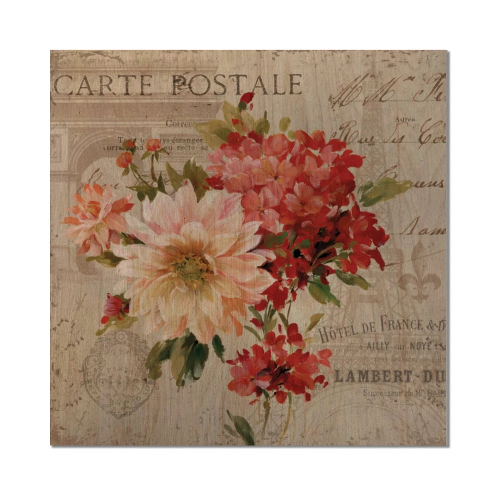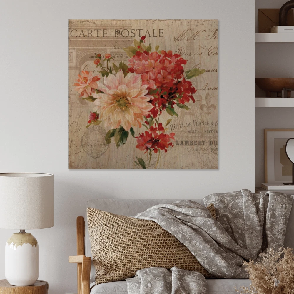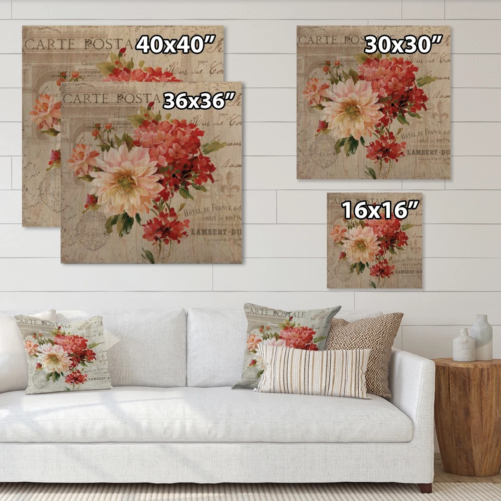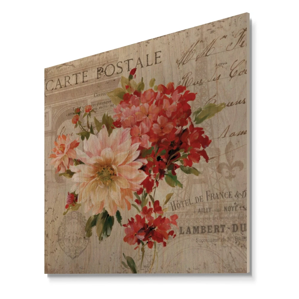 Alas, a modern take on wood wall art. Once typically a wall art piece found only in rustic or farmhouse style decor settings, this Floral wood wall art will easily fit into even the most contemporary of designs.Using the highest quality 6 Color Canon UV Ink, this Farmhouse wood wall art incorporates several aspects of fine design into one stunning piece. With its slightly visible wood grain appearing through the colors and sleekly finished edges, it is a wonderful choice for any room in your home or office, being it a traditional or modern space. As each piece of wood has natural grain differences from the next, each of these wood wall arts is a truly unique addition to your space.Each Wood wall art is 100% handmade in Canada on Natural pine wood, using the highest quality ink which will Free Shipping Over $49.99* Details Designart 'Red Painted Flowers on Vintage Postcard III' Farmhouse Print on Product Description: Alas, a modern take on wood wall art. Once typically a wall art piece found only in rustic or farmhouse style decor settings, this Floral wood wall art will easily fit into even the most contemporary of designs. Using the highest quality 6 Color Canon UV Ink, this Farmhouse wood wall art incorporates several aspects of fine design into one stunning piece. With its slightly visible wood grain appearing through the colors and sleekly finished edges, it is a wonderful choice for any room in your home or office, being it a traditional or modern space. As each piece of wood has natural grain differences from the next, each of these wood wall arts is a truly unique addition to your space. Each Wood wall art is 100% handmade in Canada on Natural pine wood, using the highest quality ink which will not fade over time. Available in Differents sizes - OrientationSQUARE - SubjectFloral TypeWood Wall Art, Fine Art, Wood Fine Art, Print on Plaque - Arrives ready to hang on the wall with hanging kit included - MaterialMade with 100% natural pine wood - StyleFarmhouse - Number of Pieces1 - ColorRed