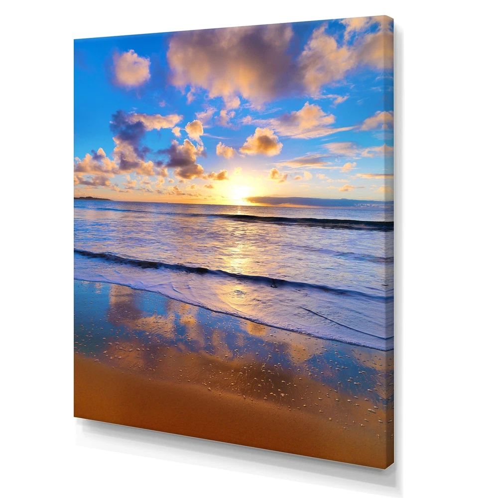 This beautiful Rising Sun Over Beach Horizon Canvas Art is printed using the highest quality fade-resistant ink on canvas. Every one of our fine art giclee canvas prints is printed on premium quality cotton canvas, using the finest quality inks which will not fade over time. Each giclee print is stretched tightly over a 1-inch wood sub frame for small size prints or a 1.5-inch wood subframe for large size prints (40x30 60x28 ...) ensuring the canvas is taught and does not buckle. This canvas art print is gallery-wrapped (the design continues on the sides), giving it a real art gallery feel. All of our canvas prints are carefully packaged with plastic protection, fragile labeling, and sturdy boxes to ensure safe delivery. Every canvas print arrives ready to hang on the wall, with the Free Shipping Over $49.99* Details Designart "Rising Sun Over Beach Horizon" Nautical & Coastal Canvas Wall Art Product Description: This beautiful Rising Sun Over Beach Horizon Canvas Art is printed using the highest quality fade-resistant ink on canvas. Every one of our fine art giclee canvas prints is printed on premium quality cotton canvas, using the finest quality inks which will not fade over time. Each giclee print is stretched tightly over a 1-inch wood sub frame for small size prints or a 1.5-inch wood subframe for large size prints (40x30 60x28 ...) ensuring the canvas is taught and does not buckle. This canvas art print is gallery-wrapped (the design continues on the sides), giving it a real art gallery feel. All of our canvas prints are carefully packaged with plastic protection, fragile labeling, and sturdy boxes to ensure safe delivery. Every canvas print arrives ready to hang on the wall, with the hanging kits included. - Style Nautical & Coastal - Subject Beach, Landscapes - Color Blue - This canvas giclee print is gallery-wrapped (the design continues on the sides) , giving it a real art gallery feel. - Premium quality cotton canvas. - Arrives ready to hang on the wall - Easy to Hang