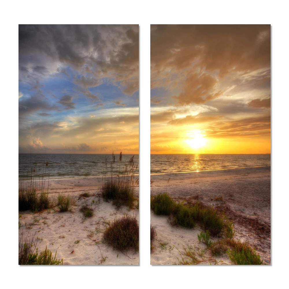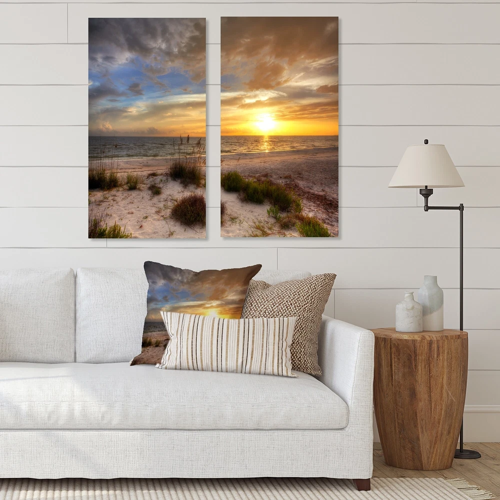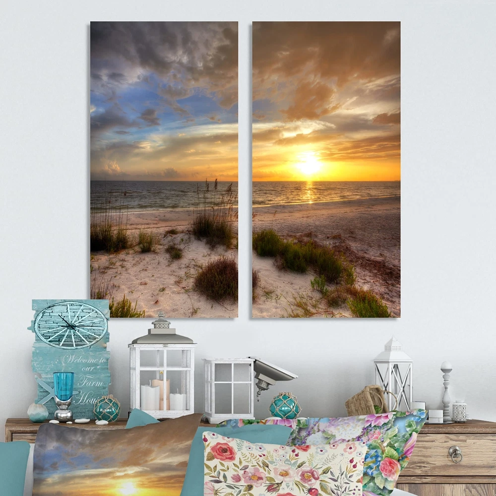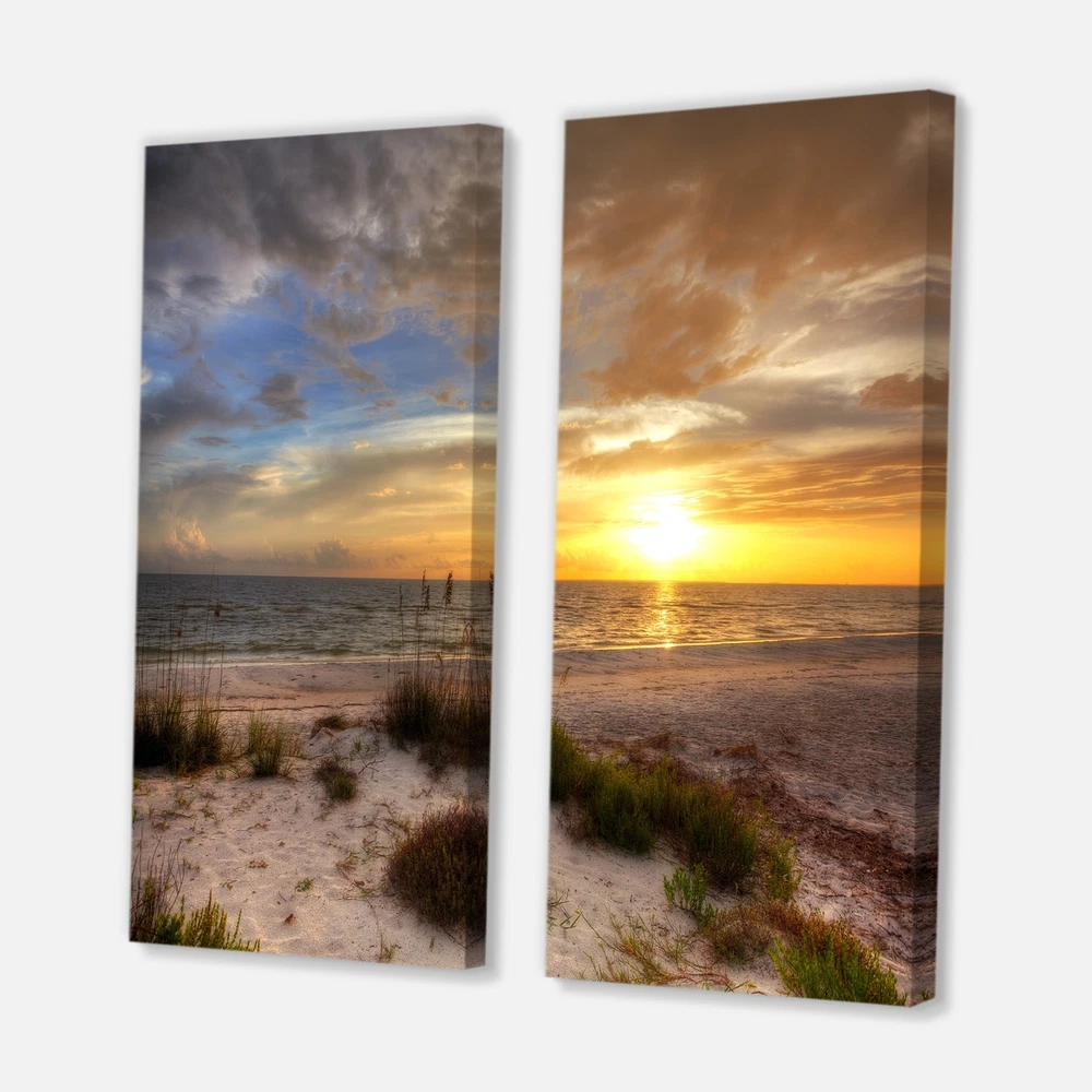 This beautiful Nautical & Coastal 2 piece set of Canvas Art is printed using the highest quality fade-resistant ink on canvas. Every one of our fine art giclee canvas prints is printed on premium quality cotton canvas, using the finest quality inks which will not fade over time. Each giclee print is stretched tightly over a 1-inch wood sub frame ensuring the canvas is taught and does not buckle. This canvas art print is gallery-wrapped (the design continues on the sides), giving it a real art gallery feel. All of our canvas prints are carefully packaged with plastic protection, fragile labeling, and sturdy boxes to ensure safe delivery. Every canvas print arrives ready to hang on the wall, with the hanging kits included.- Style : Nautical & Coastal- Subject : Beach, Landscapes- Color : Free Shipping Over $49.99* Details Designart "Sandy Beach with sunset" Sea & Shore Canvas Wall Art Print 2 Piece Product Description: This beautiful Nautical & Coastal 2 piece set of Canvas Art is printed using the highest quality fade-resistant ink on canvas. Every one of our fine art giclee canvas prints is printed on premium quality cotton canvas, using the finest quality inks which will not fade over time. Each giclee print is stretched tightly over a 1-inch wood sub frame ensuring the canvas is taught and does not buckle. This canvas art print is gallery-wrapped (the design continues on the sides), giving it a real art gallery feel. All of our canvas prints are carefully packaged with plastic protection, fragile labeling, and sturdy boxes to ensure safe delivery. Every canvas print arrives ready to hang on the wall, with the hanging kits included. - Style Nautical & Coastal - Subject Beach, Landscapes - Color Brown - This canvas giclee print is gallery-wrapped (the design continues on the sides), giving it a real art gallery feel. - Premium quality cotton canvas. - Arrives ready to hang on the wall - Easy to Hang