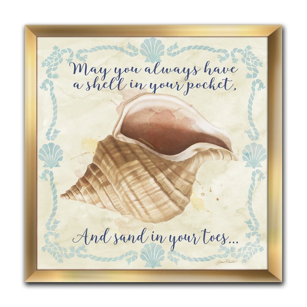 Amp up the coastal vibes in your home with this 'Sea Shells-B' art print from Designart. Featuring a large conch shell graphic bordered with delicate pieces of rope and seashells, this piece delivers a nautical look to tie together the other sea-themed elements in your space. A beach-themed quote completes the relaxed, welcoming feeling. Choose from a variety of frame colors to match your room's color palette, and rely on the included hardware for fast and convenient installation on any wall.This framed art print is available in many different color frames. All of our framed art prints are carefully packaged with corner protectors, fragile labeling, and sturdy boxes to ensure a safe delivery. Every framed art arrives ready to hang on the wall, with the hanging kit included.Features:Style : Free Shipping Over $49.99* Details Designart "Sea Shells-B" Nautical & Coastal Framed Art Print Product Description: Amp up the coastal vibes in your home with this 'Sea Shells-B' art print from Designart. Featuring a large conch shell graphic bordered with delicate pieces of rope and seashells, this piece delivers a nautical look to tie together the other sea-themed elements in your space. A beach-themed quote completes the relaxed, welcoming feeling. Choose from a variety of frame colors to match your room's color palette, and rely on the included hardware for fast and convenient installation on any wall. This framed art print is available in many different color frames. All of our framed art prints are carefully packaged with corner protectors, fragile labeling, and sturdy boxes to ensure a safe delivery. Every framed art arrives ready to hang on the wall, with the hanging kit included. Features: Style Nautical & Coastal Subject Animals Color Brown Premium quality cotton canvas mounted. Available in several frame colors. Arrives with instructions and hanging kit