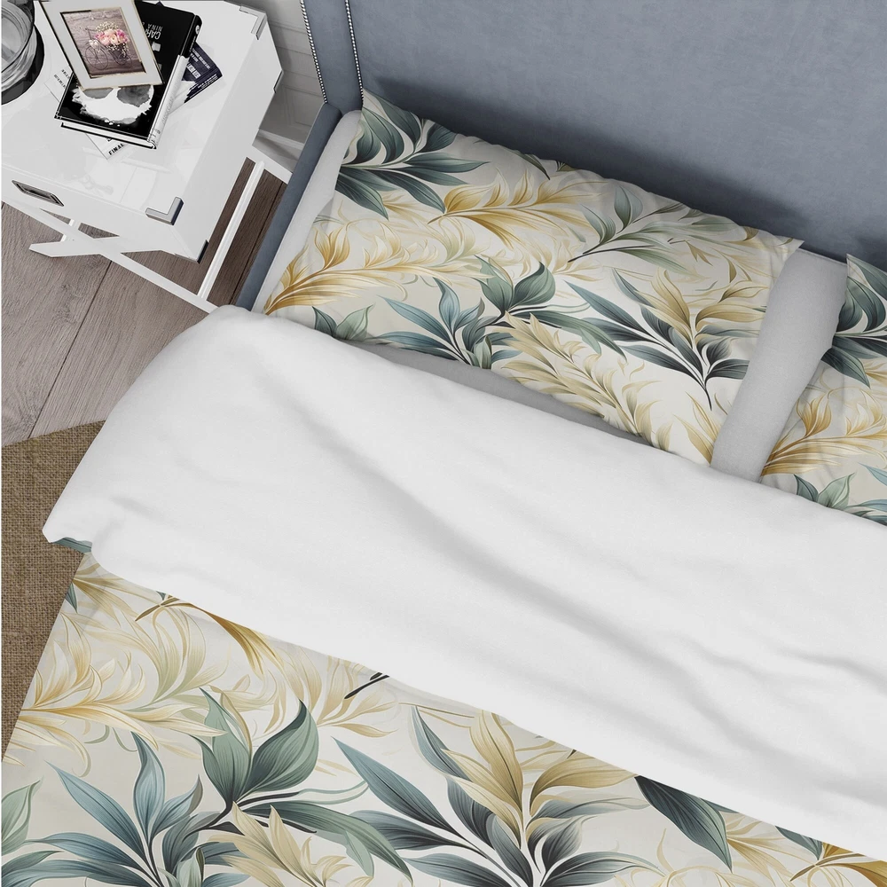 There is just nothing better than a beautiful, inviting comfortable bed after a long day. This Botanical, Nature, Floral bed set is created using the richest colors stemming from high density Italian ink and the softest fabrics making it the perfect way to spruce up your bedroom, while keeping it ultra-comfortable. This luxurious Serene Ferns I bed design is made with 100% microfiber polyester, making it ultra-soft to ensure you sleep comfortably all night long. This Bohemian & Eclectic set includes 1 Bed Cover and 2 Shams and is available in twin, queen and king sizes.This Bedding Set is easily integrated into your already decorated space.What's Included? - Duvet Cover - Shams - Pillow Cases not included but can be buy separately - Comforter Insert NOT INCLUDEDFeatures - Free Shipping Over $49.99* Details Designart "Serene Ferns I" Floral Bedding Cover Set With 2 Shams Product Description: There is just nothing better than a beautiful, inviting comfortable bed after a long day. This Botanical, Nature, Floral bed set is created using the richest colors stemming from high density Italian ink and the softest fabrics making it the perfect way to spruce up your bedroom, while keeping it ultra-comfortable. This luxurious Serene Ferns I bed design is made with 100% microfiber polyester, making it ultra-soft to ensure you sleep comfortably all night long. This Bohemian & Eclectic set includes 1 Bed Cover and 2 Shams and is available in twin, queen and king sizes. This Bedding Set is easily integrated into your already decorated space. What's Included? - Duvet Cover - Shams - Pillow Cases not included but can be buy separately - Comforter Insert NOT INCLUDED Features - Printed using High Density Italian Ink making the colors extra vibrant. - Made from ultra-soft, lightweight 100% microfiber polyester. Wrinkle resistant fabric. Down-like comfort, odorless. - The Bohemian & Eclectic bed set includes one bed cover and two standard pillow shams to create a complete and stylish look. - The elegant and soft colors are both trendy and fun to brighten and update your bedroom. - Made in Canada - Decorative Wall Art and throw pillows to match this set are available but sold separately. - Actual comforter inserts and pillow inserts are not included. This set includes the two pillow shams and comforter cover only. King Dimensions: - 1 Duvet Cover104 inches wide x 88 inches long - 2 King Shams20 inches wide x 36 inches long Queen Dimensions: - 1 Duvet Cover88 inches wide x 88 inches long - 2 Standard Shams16 inches wide x 26 inches long Twin Dimensions: - 1 Duvet Cover68 inches wide x 88 inches long - 1 Standard Sham16 inches wide x 26 inches long Product Details - MaterialPolyester. - PatternFloral - ColorGreen - StyleBohemian & Eclectic - ReversibleNo Directions: Fabric Care InstructionsMachine wash on cold gentle cycle. Wash separately on first wash. Use only non- chlorine bleach when needed. Tumble dry low. Remove promptly.