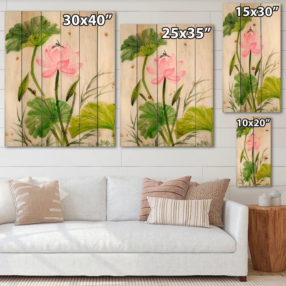 Alas, a modern take on wood wall art. Once typically a wall art piece found only in rustic or farmhouse style decor settings, this Floral wood wall art will easily fit into even the most contemporary of designs.Using the highest quality 6 Color Canon UV Ink, this Traditional wood wall art incorporates several aspects of fine design into one stunning piece. With its slightly visible wood grain appearing through the colors and sleekly finished edges, it is a wonderful choice for any room in your home or office, being it a traditional or modern space. As each piece of wood has natural grain differences from the next, each of these wood wall arts is a truly unique addition to your space.Each Wood wall art is 100% handmade in Canada on Natural pine wood, using the highest quality ink which will Free Shipping Over $49.99* Details Designart 'Single Vintage Lotus Flower With Green Leaves' Traditional Print on Product Description: Alas, a modern take on wood wall art. Once typically a wall art piece found only in rustic or farmhouse style decor settings, this Floral wood wall art will easily fit into even the most contemporary of designs. Using the highest quality 6 Color Canon UV Ink, this Traditional wood wall art incorporates several aspects of fine design into one stunning piece. With its slightly visible wood grain appearing through the colors and sleekly finished edges, it is a wonderful choice for any room in your home or office, being it a traditional or modern space. As each piece of wood has natural grain differences from the next, each of these wood wall arts is a truly unique addition to your space. Each Wood wall art is 100% handmade in Canada on Natural pine wood, using the highest quality ink which will not fade over time. Available in Differents sizes - OrientationVertical - SubjectFloral TypeWood Wall Art, Fine Art, Wood Fine Art, Print on Plaque - Arrives ready to hang on the wall with hanging kit included - MaterialMade with 100% natural pine wood - StyleTraditional - Number of Pieces1 - ColorPink
