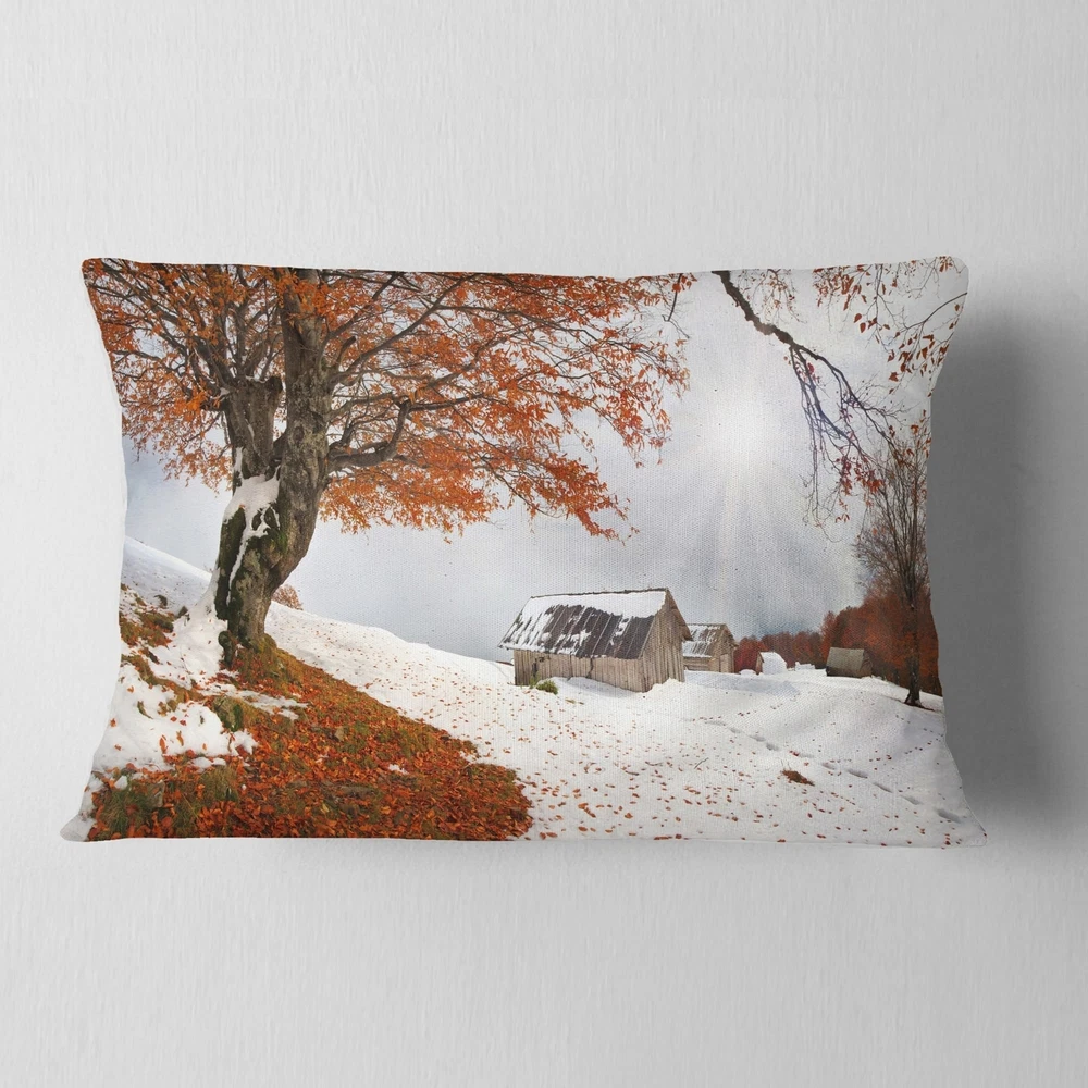 Decorative Throw Pillows for Couch Bed Sofa with Zip CoversAn easy, fun way to add a pop of color or bring new life to any room in your home or office is with these beautiful Landscape throw pillows. Dress up your bed, sofa or lounger with this decorative design art pillows. Perfect as Farmhouse bedroom décor, lounge décor Traditional living room décor. It adds a fun accent to any room. Throw pillows really do work wonders: they can transform any room from uninviting discomfort to warm and welcoming. And they really do go almost anywhere - arrange a couple on the couch or sofa, place one in your overstuffed chair for extra coziness, toss a couple on the bed and prop yourself up for a great read.These Landscapes pillow is printed using High Color Density Italian inks to create a vibrantly Free Shipping Over $49.99* Details Designart 'Sudden Snow in First Autumn' Landscape Photography Throw Pillow Product Description: Decorative Throw Pillows for Couch Bed Sofa with Zip Covers An easy, fun way to add a pop of color or bring new life to any room in your home or office is with these beautiful Landscape throw pillows. Dress up your bed, sofa or lounger with this decorative design art pillows. Perfect as Farmhouse bedroom décor, lounge décor Traditional living room décor. It adds a fun accent to any room. Throw pillows really do work wondersthey can transform any room from uninviting discomfort to warm and welcoming. And they really do go almost anywhere - arrange a couple on the couch or sofa, place one in your overstuffed chair for extra coziness, toss a couple on the bed and prop yourself up for a great read. These Landscapes pillow is printed using High Color Density Italian inks to create a vibrantly colored, sharp artwork. Features: Perfect accent to any furniture piece Basic shapes with a modern graphic design twist Printed on 100% light weight polyester Cushion filled with 100% polyester fill Wrinkle resistant fabric Zip Closure so you can remove the pillow from its' cover Down-like comfort - Odorless 100% Hypoallergenic Machine Wash Cold Separately, Gently Cycle Only, No bleach, hang to dry Print on Demand with High Density Italian Ink Available in Several sizes Attribute :Farmhouse, Traditional, Fine Art Giclee Subject Landscapes, Country Charrm, photography