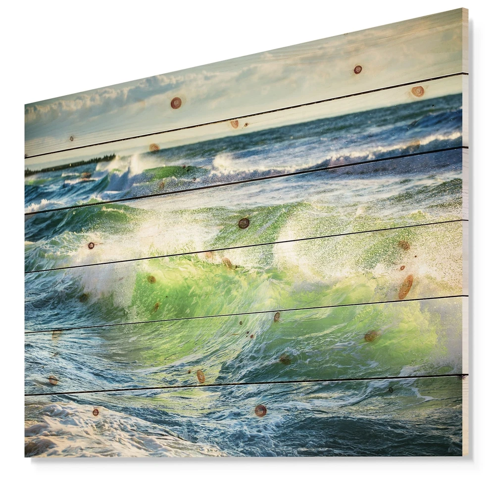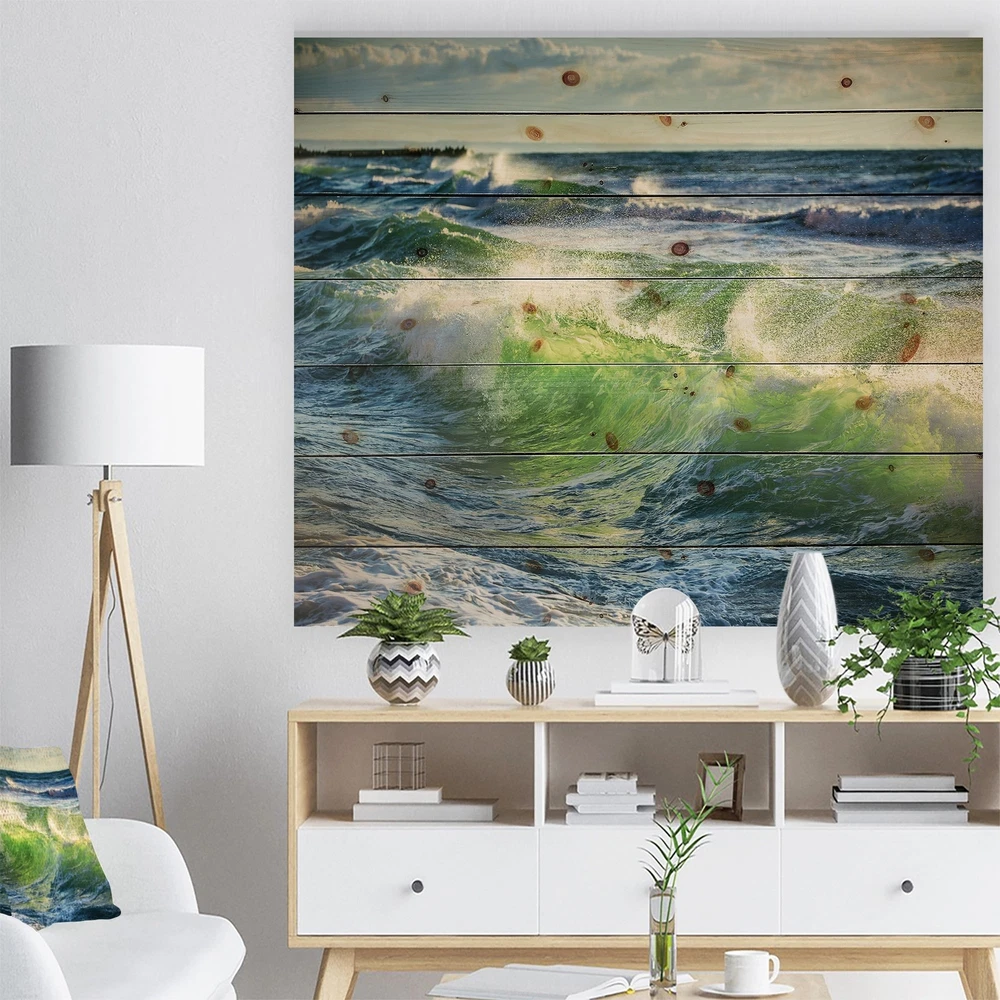Alas, a modern take on wood wall art. Once typically a wall art piece found only in rustic or farmhouse style decor settings, this Sea & Shore wood wall art will easily fit into even the most contemporary of designs.Using the highest quality 6 Color Canon UV Ink, this Nautical & Coastal wood wall art incorporates several aspects of fine design into one stunning piece. With its slightly visible wood grain appearing through the colors and sleekly finished edges, it is a wonderful choice for any room in your home or office, being it a traditional or modern space. As each piece of wood has natural grain differences from the next, each of these wood wall arts is a truly unique addition to your space.Each Wood wall art is 100% handmade in Canada on Natural pine wood, using the highest quality Free Shipping Over $49.99* Details Designart 'Sunrise and Shining Waves in Ocean' Beach Photo Print on Natural Pine Product Description: Alas, a modern take on wood wall art. Once typically a wall art piece found only in rustic or farmhouse style decor settings, this Sea & Shore wood wall art will easily fit into even the most contemporary of designs. Using the highest quality 6 Color Canon UV Ink, this Nautical & Coastal wood wall art incorporates several aspects of fine design into one stunning piece. With its slightly visible wood grain appearing through the colors and sleekly finished edges, it is a wonderful choice for any room in your home or office, being it a traditional or modern space. As each piece of wood has natural grain differences from the next, each of these wood wall arts is a truly unique addition to your space. Each Wood wall art is 100% handmade in Canada on Natural pine wood, using the highest quality ink which will not fade over time. Available in 3 Differents sizes 20x15, 40x30, 46x36 - OrientationHorizontal - SubjectSea & Shore TypeWood Wall Art, Fine Art, Wood Fine Art, Print on Plaque - Arrives ready to hang on the wall with hanging kit included - MaterialMade with 100% natural pine wood - StyleNautical & Coastal- Number of Pieces1 - SizeMedium, Large, Small - ColorBlue