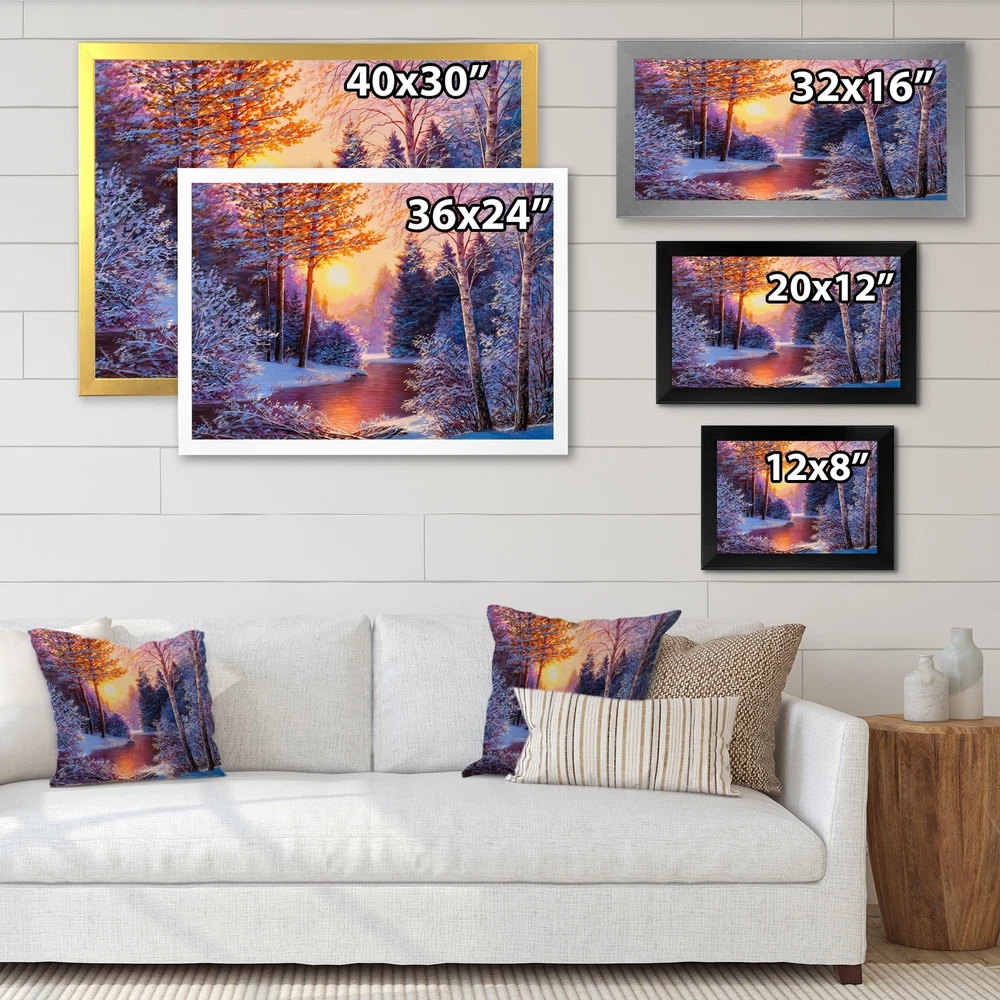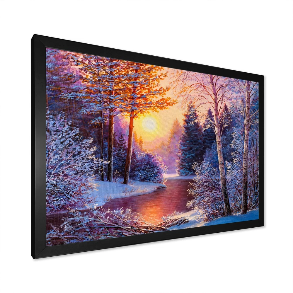 This beautiful Sunset On Winter River Painting II Framed wall Art is printed using the highest quality fade resistant ink on canvas. Every one of our Framed Giclee Prints is printed on premium quality canvas, using the finest quality inks which will not fade over time and then mounted and framed on a 1.5 inch wide frame.This framed art print is available in many different color frames. All of our framed art prints are carefully packaged with corner protectors, fragile labeling, and sturdy boxes to ensure a safe delivery. Every framed art arrives ready to hang on the wall, with the hanging kit included.Features:- Style : Traditional- Subject : Landscapes, Landscape & Nature, Floral & Botanical, Trees, Lakes & Rivers, Forest, Snow, SunriseSunset- Color : Blue- Premium quality cotton canvas Free Shipping Over $49.99* Details Designart "Sunset On Winter River Painting II" Traditional Framed Wall Art Product Description: This beautiful Sunset On Winter River Painting II Framed wall Art is printed using the highest quality fade resistant ink on canvas. Every one of our Framed Giclee Prints is printed on premium quality canvas, using the finest quality inks which will not fade over time and then mounted and framed on a 1.5 inch wide frame. This framed art print is available in many different color frames. All of our framed art prints are carefully packaged with corner protectors, fragile labeling, and sturdy boxes to ensure a safe delivery. Every framed art arrives ready to hang on the wall, with the hanging kit included. Features: - Style Traditional - Subject Landscapes, Landscape & Nature, Floral & Botanical, Trees, Lakes & Rivers, Forest, Snow, SunriseSunset - Color Blue - Premium quality cotton canvas mounted. - Available in several frame colors. - Arrives with instructions and hanging kit
