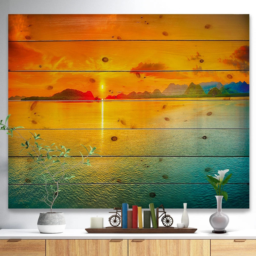 Alas, a modern take on wood wall art. Once typically a wall art piece found only in rustic or farmhouse style decor settings, this Sea & Shore wood wall art will easily fit into even the most contemporary of designs.Using the highest quality 6 Color Canon UV Ink, this Nautical & Coastal wood wall art incorporates several aspects of fine design into one stunning piece. With its slightly visible wood grain appearing through the colors and sleekly finished edges, it is a wonderful choice for any room in your home or office, being it a traditional or modern space. As each piece of wood has natural grain differences from the next, each of these wood wall arts is a truly unique addition to your space.Each Wood wall art is 100% handmade in Canada on Natural pine wood, using the highest quality Free Shipping Over $49.99* Details Designart 'Sunset Over Sea Panorama' Seascape Photography Print on Natural Pine Product Description: Alas, a modern take on wood wall art. Once typically a wall art piece found only in rustic or farmhouse style decor settings, this Sea & Shore wood wall art will easily fit into even the most contemporary of designs. Using the highest quality 6 Color Canon UV Ink, this Nautical & Coastal wood wall art incorporates several aspects of fine design into one stunning piece. With its slightly visible wood grain appearing through the colors and sleekly finished edges, it is a wonderful choice for any room in your home or office, being it a traditional or modern space. As each piece of wood has natural grain differences from the next, each of these wood wall arts is a truly unique addition to your space. Each Wood wall art is 100% handmade in Canada on Natural pine wood, using the highest quality ink which will not fade over time. Available in 3 Differents sizes 20x15, 40x30, 46x36 - OrientationHorizontal - SubjectSea & Shore TypeWood Wall Art, Fine Art, Wood Fine Art, Print on Plaque - Arrives ready to hang on the wall with hanging kit included - MaterialMade with 100% natural pine wood - StyleNautical & Coastal- Number of Pieces1 - SizeMedium, Large, Small - ColorOrange