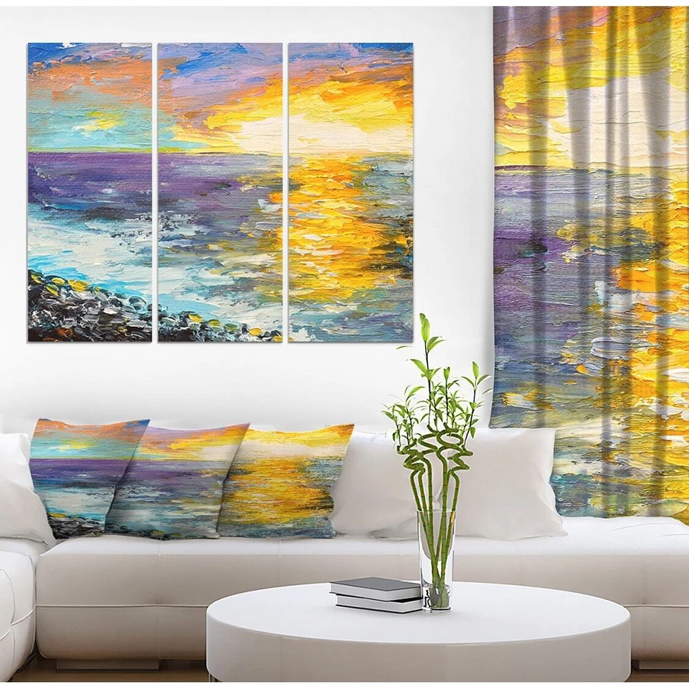 This beautiful Sea & Shore Canvas Art is printed using the highest quality fade resistant ink on canvas. Every one of our fine art giclee canvas prints is printed on premium quality cotton canvas, using the finest quality inks which will not fade over time. Each giclee print is stretched tightly over a 1 inch wood sub frame ensuring the canvas is taught and does not buckle. This canvas art print is gallery-wrapped (the design continues on the sides) , giving it a real art gallery feel. All of our canvas prints are carefully packaged with plastic protection, fragile labeling and sturdy boxes to ensure a safe delivery. Every canvas print arrives ready to hang on the wall, with the hanging kits included.- Style : Nautical & Coastal- Subject : Sea & Shore, Nautical- Color : Blue- This canvas Free Shipping Over $49.99* Details Designart "Sunset on the Coast" Sea & Shore Print on Wrapped Canvas set - 36x28 Product Description: This beautiful Sea & Shore Canvas Art is printed using the highest quality fade resistant ink on canvas. Every one of our fine art giclee canvas prints is printed on premium quality cotton canvas, using the finest quality inks which will not fade over time. Each giclee print is stretched tightly over a 1 inch wood sub frame ensuring the canvas is taught and does not buckle. This canvas art print is gallery-wrapped (the design continues on the sides) , giving it a real art gallery feel. All of our canvas prints are carefully packaged with plastic protection, fragile labeling and sturdy boxes to ensure a safe delivery. Every canvas print arrives ready to hang on the wall, with the hanging kits included. - Style Nautical & Coastal - Subject Sea & Shore, Nautical - Color Blue - This canvas giclee print is gallery-wrapped (the design continues on the sides) , giving it a real art gallery feel. - Premium quality cotton canvas. - Arrives ready to hang on the wall - Easy to Hang