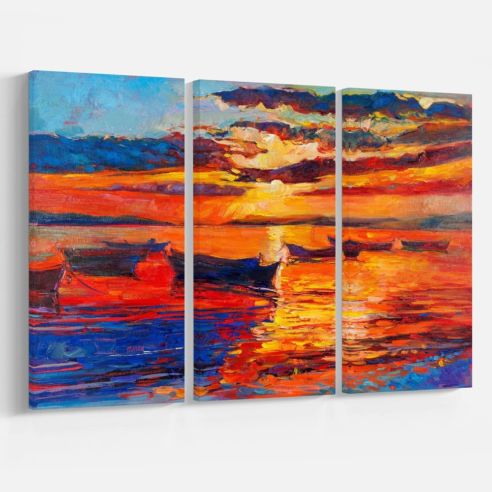 This beautiful Nautical Canvas Art is printed using the highest quality fade resistant ink on canvas. Every one of our fine art giclee canvas prints is printed on premium quality cotton canvas, using the finest quality inks which will not fade over time. Each giclee print is stretched tightly over a 1 inch wood sub frame ensuring the canvas is taught and does not buckle. This canvas art print is gallery-wrapped (the design continues on the sides) , giving it a real art gallery feel. All of our canvas prints are carefully packaged with plastic protection, fragile labeling and sturdy boxes to ensure a safe delivery. Every canvas print arrives ready to hang on the wall, with the hanging kits included.- Style : Nautical & Coastal- Subject : Nautical, Sea & Shore- Color : Orange- This canvas Free Shipping Over $49.99* Details Designart "Sunset over ocean" Nautical Print on Wrapped Canvas set - 36x28 - 3 Product Description: This beautiful Nautical Canvas Art is printed using the highest quality fade resistant ink on canvas. Every one of our fine art giclee canvas prints is printed on premium quality cotton canvas, using the finest quality inks which will not fade over time. Each giclee print is stretched tightly over a 1 inch wood sub frame ensuring the canvas is taught and does not buckle. This canvas art print is gallery-wrapped (the design continues on the sides) , giving it a real art gallery feel. All of our canvas prints are carefully packaged with plastic protection, fragile labeling and sturdy boxes to ensure a safe delivery. Every canvas print arrives ready to hang on the wall, with the hanging kits included. - Style Nautical & Coastal - Subject Nautical, Sea & Shore - Color Orange - This canvas giclee print is gallery-wrapped (the design continues on the sides) , giving it a real art gallery feel. - Premium quality cotton canvas. - Arrives ready to hang on the wall - Easy to Hang