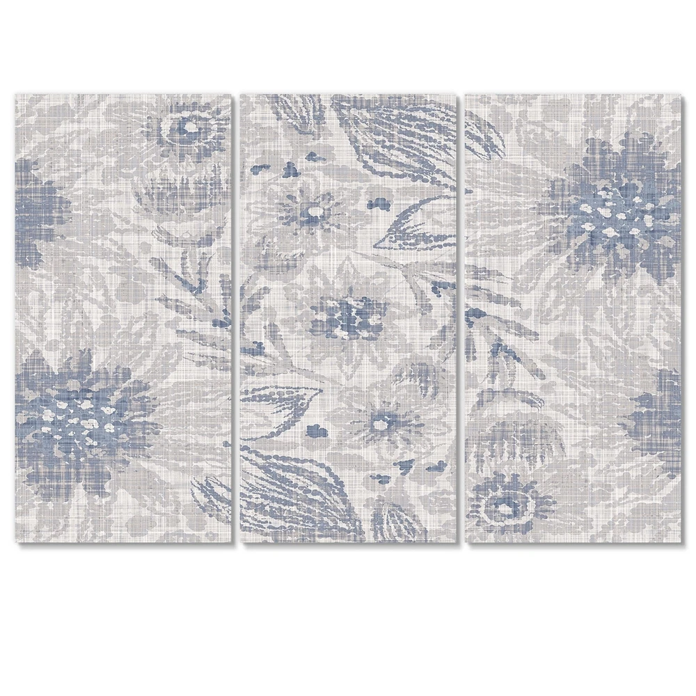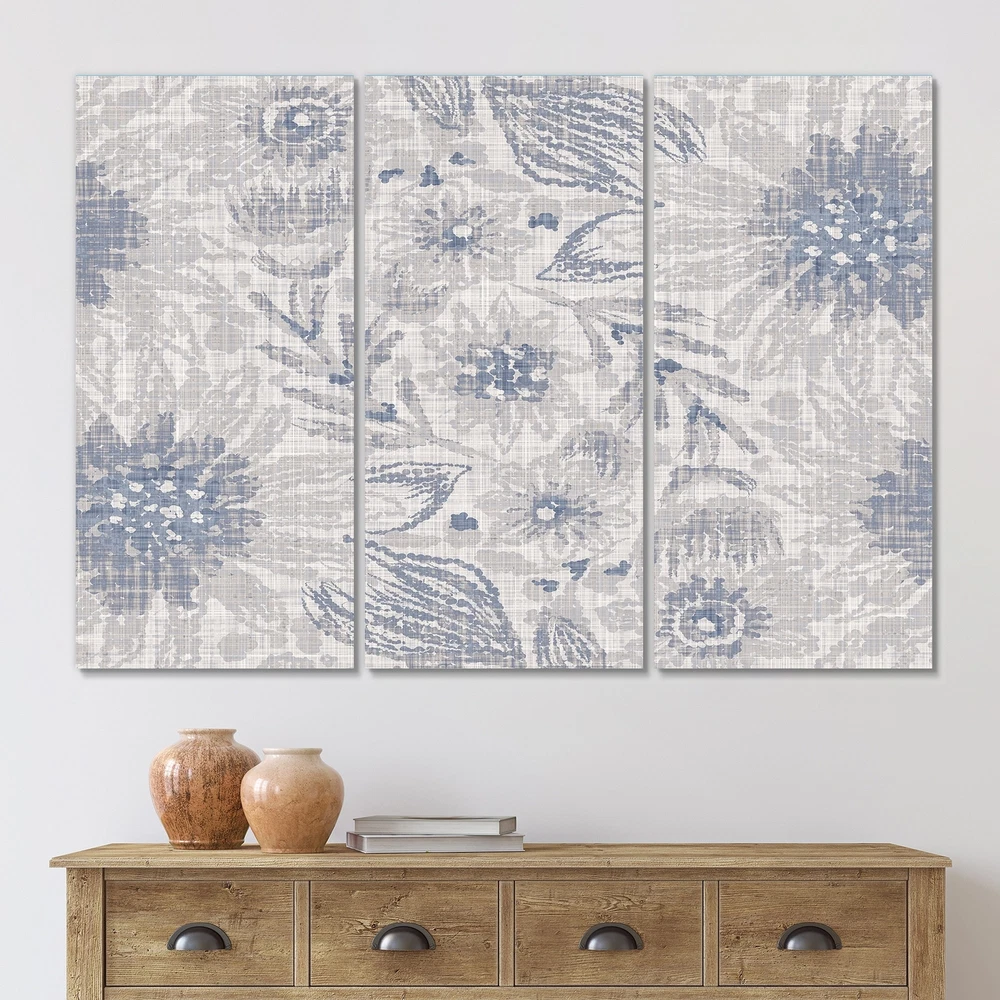 This beautiful Vintage Blue Farmhouse Flower V Multipanels canvas art is printed using the highest quality fade-resistant ink on canvas. Every one of our fine art giclee canvas prints is printed on premium quality cotton canvas, using the finest quality inks which will not fade over time. Each giclee print is stretched tightly over a 1-inch wood subframe ensuring the canvas is taught and does not buckle. This canvas art print is gallery-wrapped (the design continues on the sides), giving it a real art gallery feel. All of our canvas prints are carefully packaged with plastic protection, fragile labeling, and sturdy boxes to ensure safe delivery. Every canvas print arrives ready to hang on the wall, with the hanging kits included.- Style : Patterned- Subject : Floral, - Color : Grey- This Free Shipping Over $49.99* Details Designart "Vintage Blue Farmhouse Flower V" Patterned Canvas Wall Art Print Product Description: This beautiful Vintage Blue Farmhouse Flower V Multipanels canvas art is printed using the highest quality fade-resistant ink on canvas. Every one of our fine art giclee canvas prints is printed on premium quality cotton canvas, using the finest quality inks which will not fade over time. Each giclee print is stretched tightly over a 1-inch wood subframe ensuring the canvas is taught and does not buckle. This canvas art print is gallery-wrapped (the design continues on the sides), giving it a real art gallery feel. All of our canvas prints are carefully packaged with plastic protection, fragile labeling, and sturdy boxes to ensure safe delivery. Every canvas print arrives ready to hang on the wall, with the hanging kits included. - Style Patterned - Subject Floral, - Color Grey - This canvas giclee print is gallery-wrapped (the design continues on the sides) , giving it a real art gallery feel. - Premium quality cotton canvas. - Arrives ready to hang on the wall - Easy to Hang