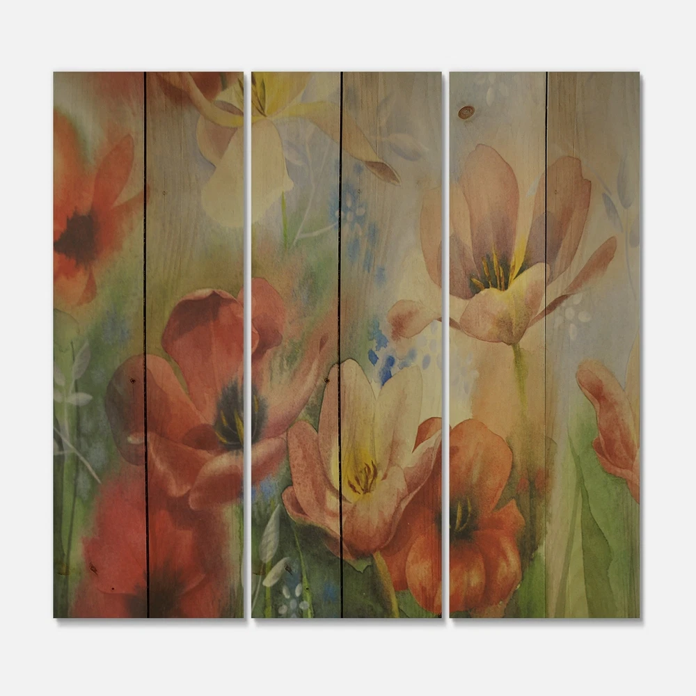 Alas, a modern take on wood wall art. Once typically a wall art piece found only in rustic or farmhouse style decor settings, this Floral wood wall art will easily fit into even the most contemporary of designs.Using the highest quality 6 Color Canon UV Ink, this Traditional wood wall art incorporates several aspects of fine design into one stunning piece. With its slightly visible wood grain appearing through the colors and sleekly finished edges, it is a wonderful choice for any room in your home or office, being it a traditional or modern space. As each piece of wood has natural grain differences from the next, each of these wood wall arts is a truly unique addition to your space.Each Wood wall art is 100% handmade in Canada on Natural pine wood, using the highest quality ink which will Free Shipping Over $49.99* Details Designart 'Vintage Flowers In Dark Pastel Colours' Traditional Print on Natural Product Description: Alas, a modern take on wood wall art. Once typically a wall art piece found only in rustic or farmhouse style decor settings, this Floral wood wall art will easily fit into even the most contemporary of designs. Using the highest quality 6 Color Canon UV Ink, this Traditional wood wall art incorporates several aspects of fine design into one stunning piece. With its slightly visible wood grain appearing through the colors and sleekly finished edges, it is a wonderful choice for any room in your home or office, being it a traditional or modern space. As each piece of wood has natural grain differences from the next, each of these wood wall arts is a truly unique addition to your space. Each Wood wall art is 100% handmade in Canada on Natural pine wood, using the highest quality ink which will not fade over time. - OrientationHorizontal - SubjectFloral TypeWood Wall Art, Fine Art, Wood Fine Art, Print on Plaque - Arrives ready to hang on the wall with hanging kit included - MaterialMade with 100% natural pine wood - StyleTraditional - Number of Pieces3 - ColorRed