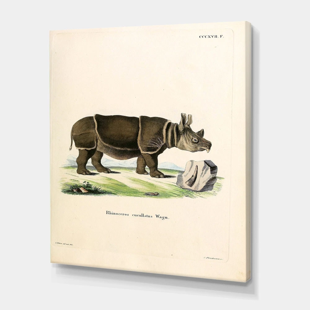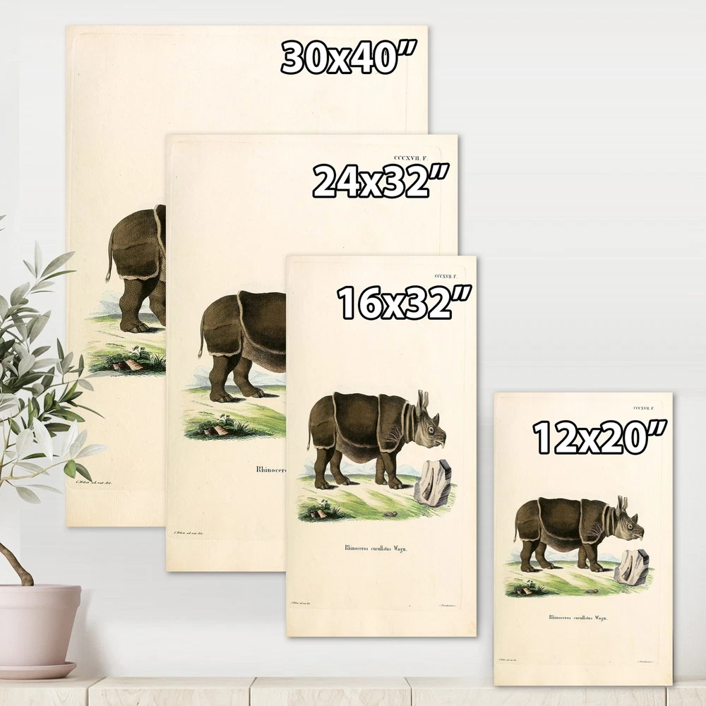 This beautiful Farmhouse Canvas Art is printed using the highest quality fade resistant ink on canvas. Every one of our fine art giclee canvas prints is printed on premium quality cotton canvas, using the finest quality inks which will not fade over time. Each giclee print is stretched tightly over a 1 inch wood sub frame for small size prints or a 1.5 inch wood sub frame for large size prints (40x30 36x36 ...) ensuring the canvas is taught and does not buckle. This canvas art print is gallery-wrapped (the design continues on the sides) , giving it a real art gallery feel. All of our canvas prints are carefully packaged with plastic protection, fragile labeling and sturdy boxes to ensure a safe delivery. Every canvas print arrives ready to hang on the wall, with the hanging kits included.- Free Shipping Over $49.99* Details Designart "Vintage Rhinoceros" Farmhouse Canvas Wall Art Print Product Description: This beautiful Farmhouse Canvas Art is printed using the highest quality fade resistant ink on canvas. Every one of our fine art giclee canvas prints is printed on premium quality cotton canvas, using the finest quality inks which will not fade over time. Each giclee print is stretched tightly over a 1 inch wood sub frame for small size prints or a 1.5 inch wood sub frame for large size prints (40x30 36x36 ...) ensuring the canvas is taught and does not buckle. This canvas art print is gallery-wrapped (the design continues on the sides) , giving it a real art gallery feel. All of our canvas prints are carefully packaged with plastic protection, fragile labeling and sturdy boxes to ensure a safe delivery. Every canvas print arrives ready to hang on the wall, with the hanging kits included. - Style Farmhouse,Country - Subject Animals, Landscapes - Color Brown, - This canvas giclee print is gallery-wrapped (the design continues on the sides) , giving it a real art gallery feel. - Premium quality cotton canvas. - Arrives ready to hang on the wall - Easy to Hang