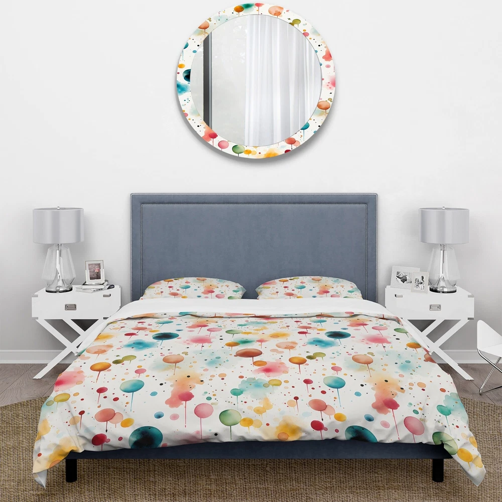 There is just nothing better than a beautiful, inviting comfortable bed after a long day. This Graphic Print, Geometric bed set is created using the richest colors stemming from high density Italian ink and the softest fabrics making it the perfect way to spruce up your bedroom, while keeping it ultra-comfortable. This luxurious Watercolor Dreams Polka Dots Pattern II bed design is made with 100% microfiber polyester, making it ultra-soft to ensure you sleep comfortably all night long. This Modern & Contemporary set includes 1 Bed Cover and 2 Shams and is available in twin, queen and king sizes.This Bedding Set is easily integrated into your already decorated space.What's Included? - Duvet Cover - Shams - Pillow Cases not included but can be buy separately - Comforter Free Shipping Over $49.99* Details Designart "Watercolor Dreams Polka Dots Pattern II" Modern Bed Cover Set With 2 Product Description: There is just nothing better than a beautiful, inviting comfortable bed after a long day. This Graphic Print, Geometric bed set is created using the richest colors stemming from high density Italian ink and the softest fabrics making it the perfect way to spruce up your bedroom, while keeping it ultra-comfortable. This luxurious Watercolor Dreams Polka Dots Pattern II bed design is made with 100% microfiber polyester, making it ultra-soft to ensure you sleep comfortably all night long. This Modern & Contemporary set includes 1 Bed Cover and 2 Shams and is available in twin, queen and king sizes. This Bedding Set is easily integrated into your already decorated space. What's Included? - Duvet Cover - Shams - Pillow Cases not included but can be buy separately - Comforter Insert NOT INCLUDED Features - Printed using High Density Italian Ink making the colors extra vibrant. - Made from ultra-soft, lightweight 100% microfiber polyester. Wrinkle resistant fabric. Down-like comfort, odorless. - The Modern & Contemporary bed set includes one bed cover and two standard pillow shams to create a complete and stylish look. - The elegant and soft colors are both trendy and fun to brighten and update your bedroom. - Made in Canada - Decorative Wall Art and throw pillows to match this set are available but sold separately. - Actual comforter inserts and pillow inserts are not included. This set includes the two pillow shams and comforter cover only. King Dimensions: - 1 Duvet Cover104 inches wide x 88 inches long - 2 King Shams20 inches wide x 36 inches long Queen Dimensions: - 1 Duvet Cover88 inches wide x 88 inches long - 2 Standard Shams16 inches wide x 26 inches long Twin Dimensions: - 1 Duvet Cover68 inches wide x 88 inches long - 1 Standard Sham16 inches wide x 26 inches long Product Details - MaterialPolyester. - PatternPolka Dots - ColorTeal - StyleModern & Contemporary - ReversibleNo Directions: Fabric Care InstructionsMachine wash on cold gentle cycle. Wash separately on first wash. Use only non- chlorine bleach when needed. Tumble dry low. Remove promptly.