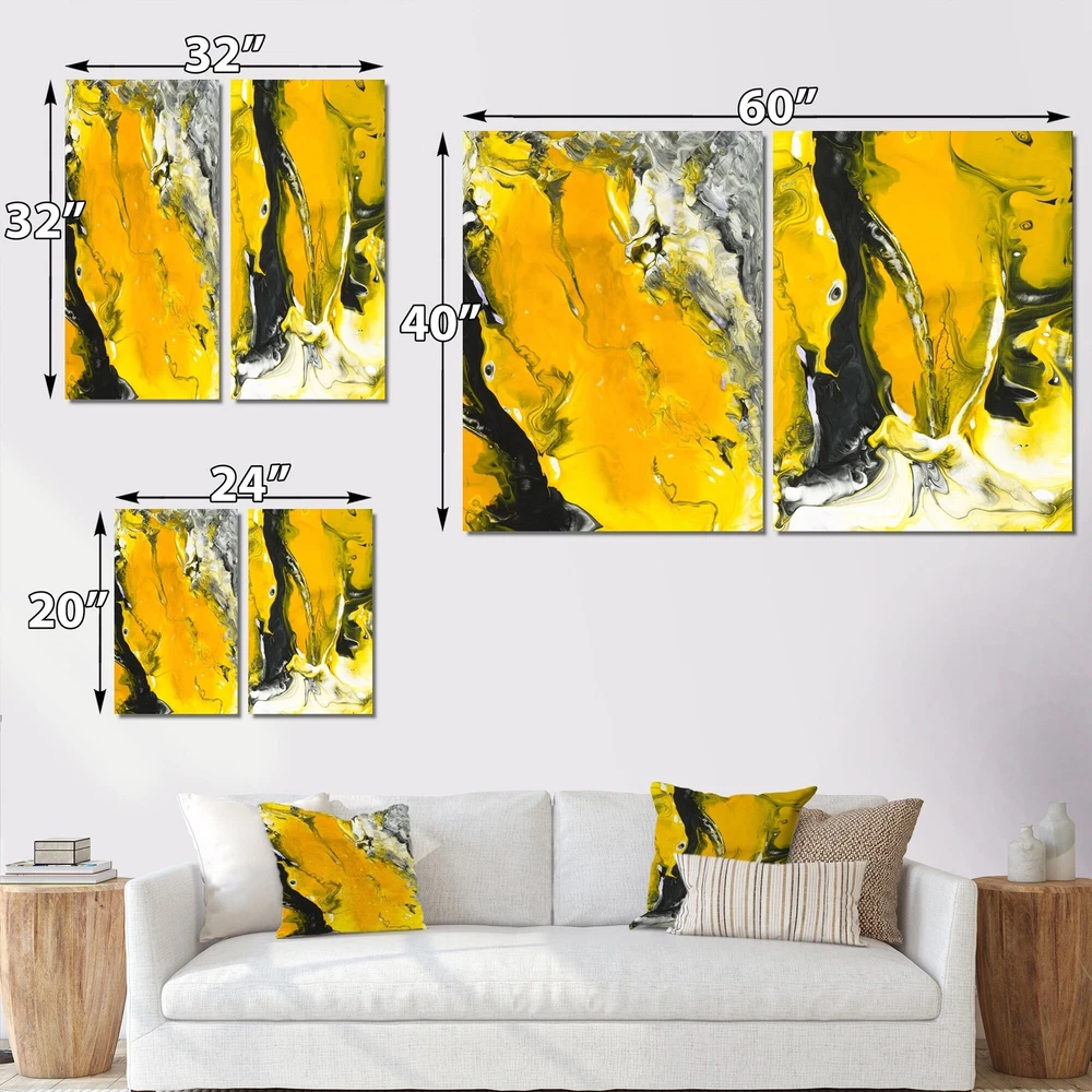 This Abstract Collage is a Collection of 2 Canvas Art printed using the highest quality fade resistant ink on canvas. Every one of our fine art giclee canvas prints is printed on premium quality cotton canvas, using the finest quality inks which will not fade over time. Each giclee print is stretched tightly over a 1 inch wood sub frame ensuring the canvas is taught and does not buckle. This canvas art print is gallery-wrapped (the design continues on the sides) , giving it a real art gallery feel. All of our canvas prints are carefully packaged with plastic protection, fragile labeling and sturdy boxes to ensure a safe delivery. Every canvas print arrives ready to hang on the wall, with the hanging kits included.- Set Include: 12"x20" / 16"x32" / 24"x36" / 30"x40"- Overall Dimensions: Free Shipping Over $49.99* Details Designart 'Yellow Black And White Liquid Art VI' Modern Art Set of 2 Pieces Product Description: This Abstract Collage is a Collection of 2 Canvas Art printed using the highest quality fade resistant ink on canvas. Every one of our fine art giclee canvas prints is printed on premium quality cotton canvas, using the finest quality inks which will not fade over time. Each giclee print is stretched tightly over a 1 inch wood sub frame ensuring the canvas is taught and does not buckle. This canvas art print is gallery-wrapped (the design continues on the sides) , giving it a real art gallery feel. All of our canvas prints are carefully packaged with plastic protection, fragile labeling and sturdy boxes to ensure a safe delivery. Every canvas print arrives ready to hang on the wall, with the hanging kits included. - Set Include12"x20" / 16"x32" / 24"x36" / 30"x40" - Overall Dimensions24"x20" / 32"x32" / 48"x36" / 60"x40" - Style Modern & Contemporary - Subject Abstract - Color Black; Yellow - This canvas giclee print is gallery-wrapped (the design continues on the sides) , giving it a real art gallery feel. - Premium quality cotton canvas. - Arrives ready to hang on the wall - Easy to Hang