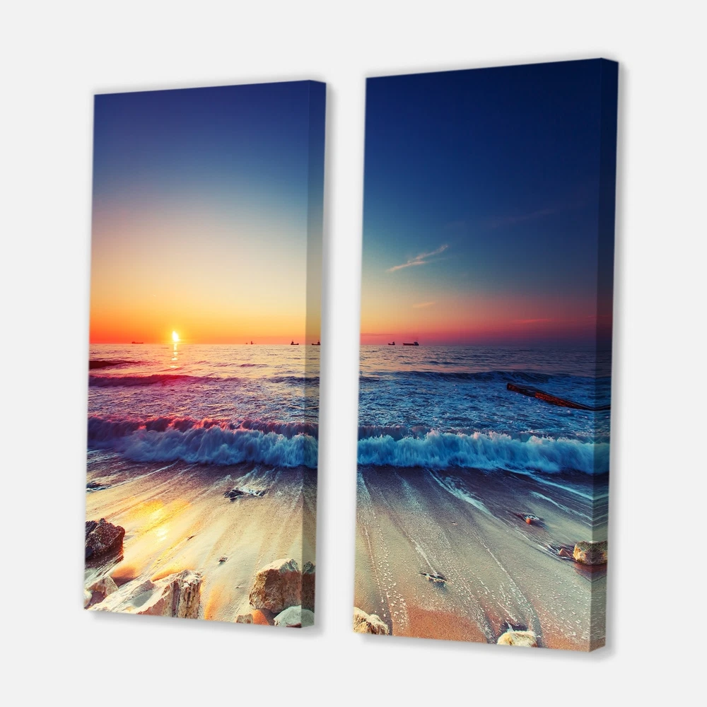 This beautiful Nautical & Coastal 2 piece set of Canvas Art is printed using the highest quality fade-resistant ink on canvas. Every one of our fine art giclee canvas prints is printed on premium quality cotton canvas, using the finest quality inks which will not fade over time. Each giclee print is stretched tightly over a 1-inch wood sub frame ensuring the canvas is taught and does not buckle. This canvas art print is gallery-wrapped (the design continues on the sides), giving it a real art gallery feel. All of our canvas prints are carefully packaged with plastic protection, fragile labeling, and sturdy boxes to ensure safe delivery. Every canvas print arrives ready to hang on the wall, with the hanging kits included.- Style : Nautical & Coastal- Subject : Beach, Landscapes- Color : Free Shipping Over $49.99* Details Designart "Beautiful Sunrise over Blue Sea" Seashore Canvas Wall Art Print 2 Product Description: This beautiful Nautical & Coastal 2 piece set of Canvas Art is printed using the highest quality fade-resistant ink on canvas. Every one of our fine art giclee canvas prints is printed on premium quality cotton canvas, using the finest quality inks which will not fade over time. Each giclee print is stretched tightly over a 1-inch wood sub frame ensuring the canvas is taught and does not buckle. This canvas art print is gallery-wrapped (the design continues on the sides), giving it a real art gallery feel. All of our canvas prints are carefully packaged with plastic protection, fragile labeling, and sturdy boxes to ensure safe delivery. Every canvas print arrives ready to hang on the wall, with the hanging kits included. - Style Nautical & Coastal - Subject Beach, Landscapes - Color Blue - This canvas giclee print is gallery-wrapped (the design continues on the sides), giving it a real art gallery feel. - Premium quality cotton canvas. - Arrives ready to hang on the wall - Easy to Hang