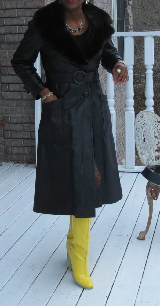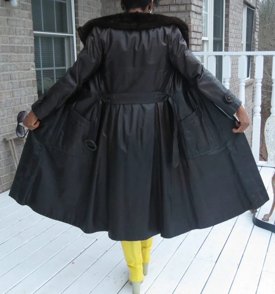 Description: Fabulous Fabulous Genuine Rare color and rare design brown genuine leather trench coat with fabulous full pelt horizontal banded mink fur lining that can be removed and mink fur collar.. the mink liner can be worn as a vest, the mink liner makes this fabulous vintage leather coat very warm. this is a fabulous coat that will generate attention. High impact classy and elegant. jacket so soft and pliable, 3 button closures. This is a Gorgeous fur coat that will look fabulous with jeans and stilettos!!. The fur is very soft and cuddly and moist. the dark brown vintage leather is in excellent preowned condition with non mentionable wear. Coat can be worn with any black belt or with the dark brown belt shown with it and left hanging loose as shown in the pic! it is a A line fitted style, fabulous look, can fit size X small to 4/6.Please check the measurement chart for specific information, but i think this is a size XS-S depending on build because of the loose cut but please check the the approximate measurements below ... Bust: about 35-37 inches Hips: about 43 inches Shoulders: about 16-17 inches tho difficult to measure since this is such a fab coat and it has cap shoulder Overall length: about 44-46 inches Sleeve length from shoulder seam: about 23-24" Please ask any and all questions prior to bidding, item guaranteed to be as described otherwise all items sold as is and are final ! Note: I can't possibly anticipate all the information every bidder might need, so ask and assume nothing that isn't specifically written. Ask all questions all sales are final except for the instances of gross misrepresentation! Terms of Sale Please note in bidding or buying this item you are entering into a binding contract, and you are agreeing to the terms stated here. All sales are final. I aim for 100% customer satisfaction on all my sales. All my items are guaranteed to be as pictured. If the listing description was not accurate, you are welcome to return the item for store credit, shipping charges at your expense. The credit can be used to buy anything in my store within 6 months of issuance. Before you return any item you must notify me and get an acceptance that I will receive it. The item being returned must show a postmark that is within 48 hours of you receiving the item; otherwise all sales are final. No returns or merchandise credit are allowed after 72 hours of delivery confirmation of receipt of the item. I have this policy to cut down on bidders that buy my items, wear it and then decide to have an excuse to return it. I hope you understand. Your purchase of this item assures that you have read the terms of this policy and are agreeing to the terms. Thanks Chistick's Couture and Collections