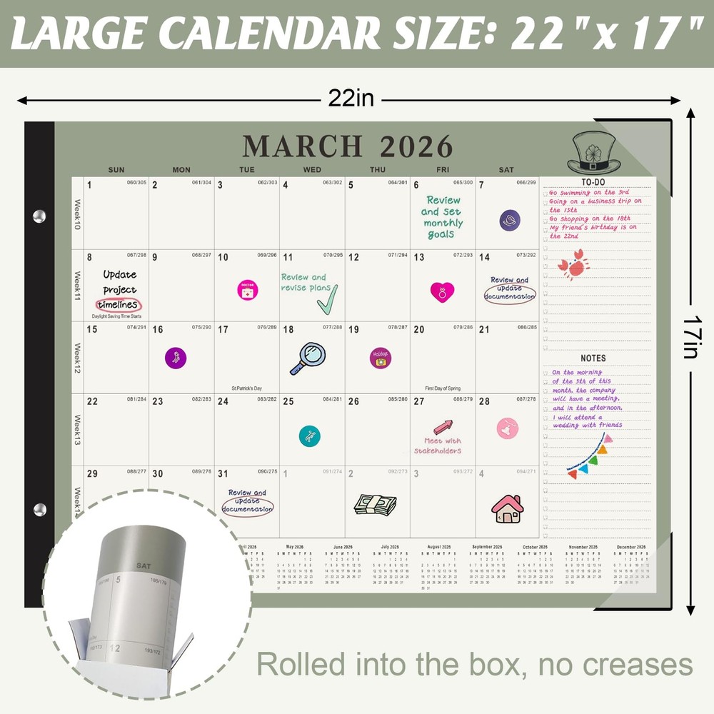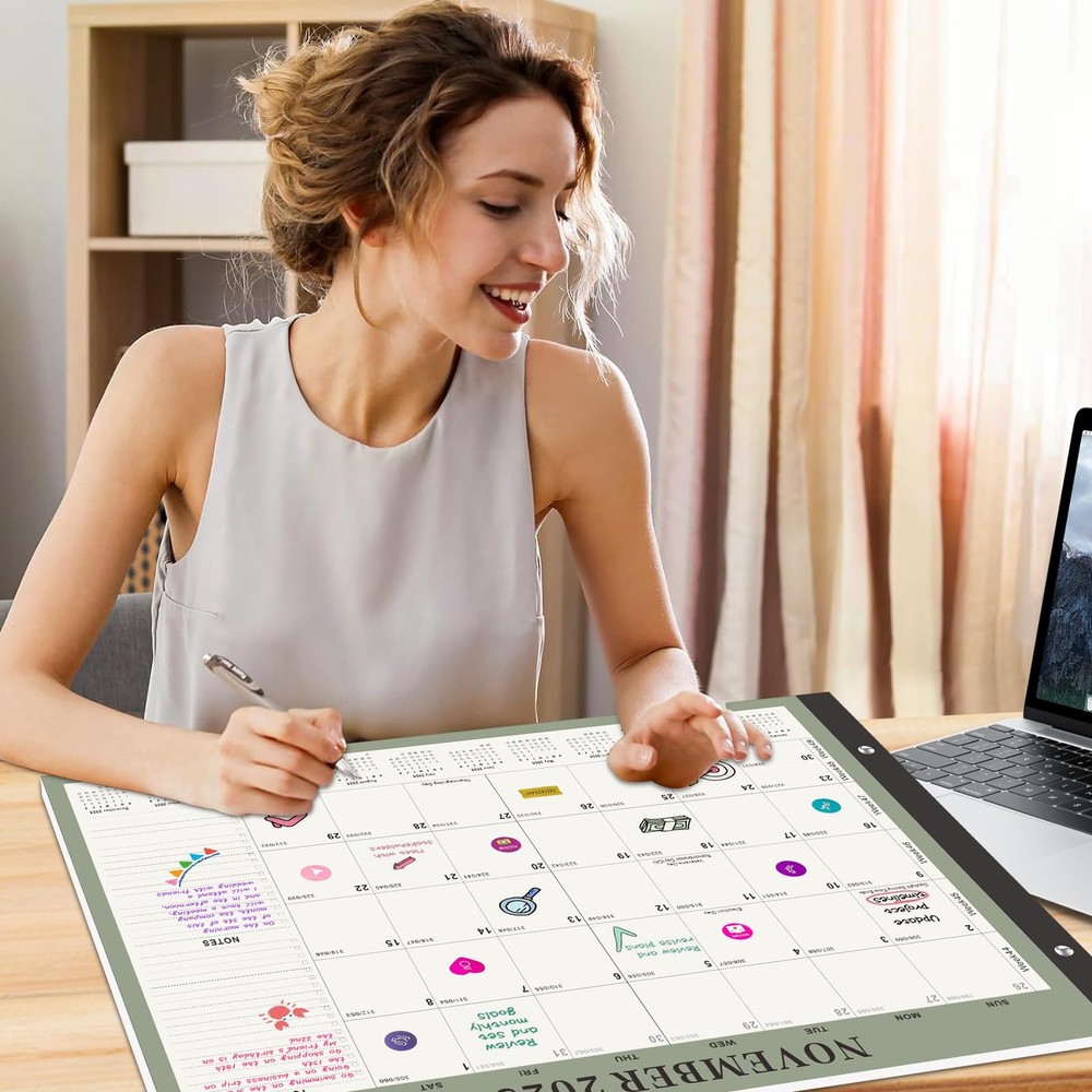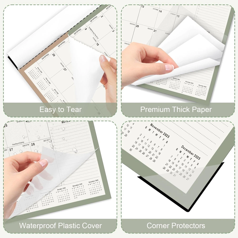 18 Monthly large 2026 desk calendar with 6 stickers, from now to Dec 2026. 22" x 17", Pages including daily blocks, notes, to do list, yearly mini monthly overview, US holiday reminders, to help you plan and organize office, school and family work efficiently. 📔【Desk Calendar 2026】18 month large 2026 desk calendar with 6 stickers, from Now to Dec 2026. 22" x 17", Pages including daily blocks, notes, to do list, yearly mini monthly overview, US holiday reminders, to help you plan and organize office, school and family work efficiently. 📔【Organization & Planning】Large monthly desk calendar 2026 adopts a daily block + notes + to do list area layout, providing more space for planning and organization. The daily block displays the progress of the whole year (past/remaining days) and holiday reminders, and comes with a full-year mini monthly calendar to help you organize your busy life and academic work, and easily track appointments and meeting activities 📔【Premium Thick Paper】- 2026 yearly academic desk calendar is made of high-quality thick paper, which can avoid ink penetration, providing you with a smooth writing experience and making your notes clear and easy to read. In addition, the cutting line allows you to easily tear off the pages of each month 📔【Plastic Cover & Two Corner Protectors】Monthly desk calendar with transparent plastic cover is waterproof and dustproof, and comes with two corner protectors to keep the page flat (Tip: You can write after opening the cover) 📔【Unique & Simple Design】2026 desk calendar combines schedule planning function with decorative aesthetics, selects 12 unique patterns, and uses low-saturation forest green to create a high-end texture. It is an excellent desktop decoration for teachers, students, academic organizers and office workers.
