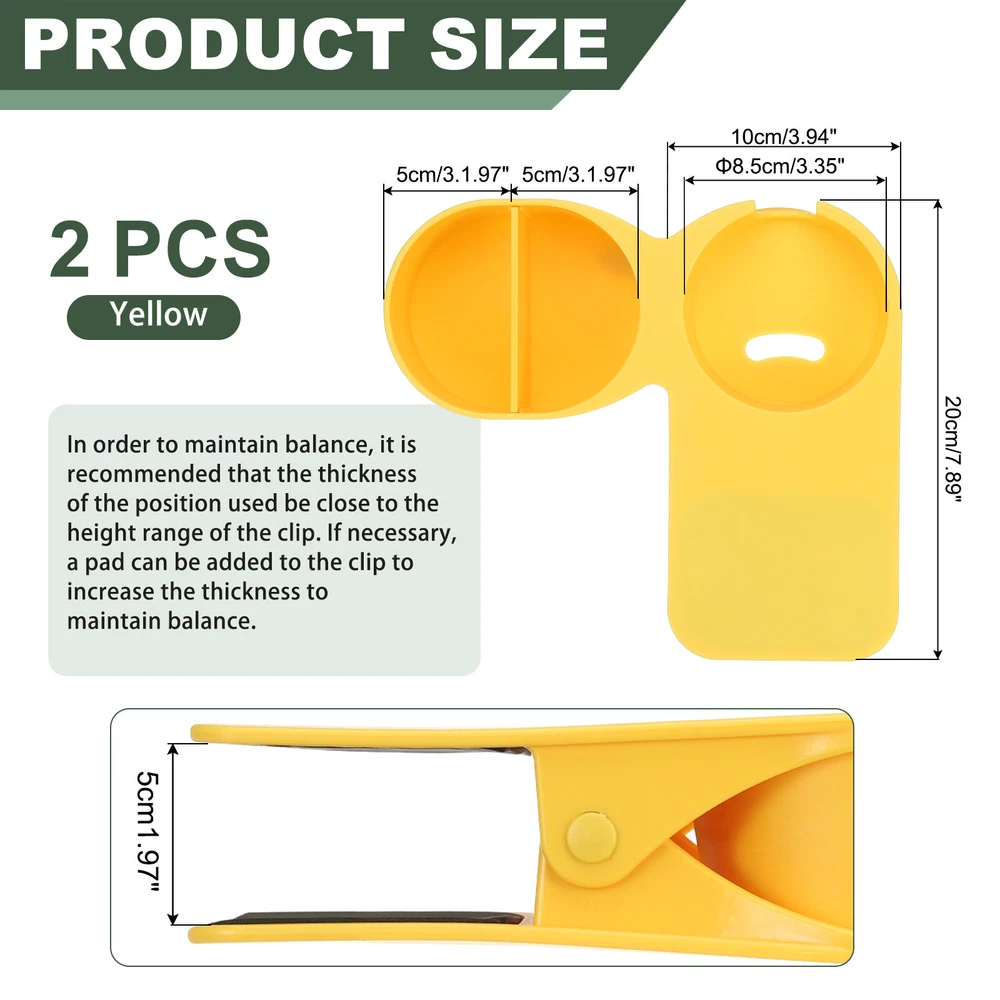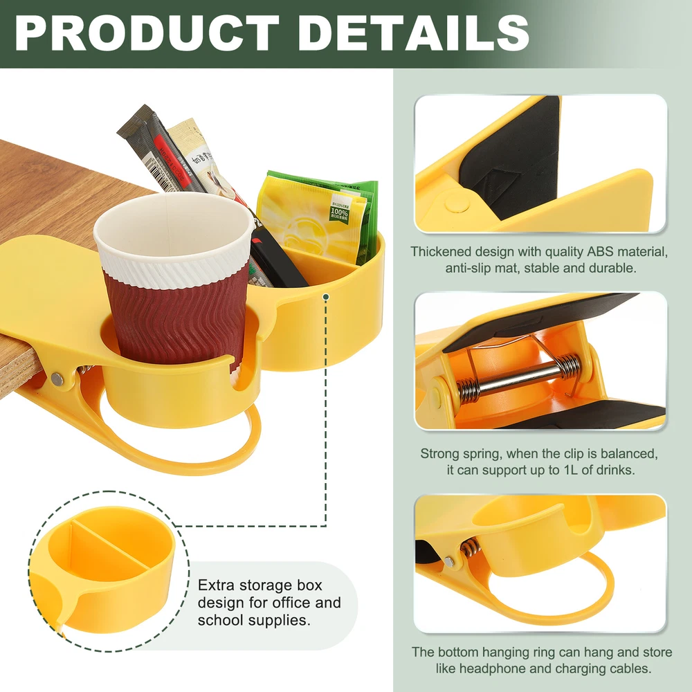 Document The product is made of plastic and metal with a black sponge pad at the cleat to provide a good grip and hold tightly to the edge of the table and chair to prevent scratching. The cup holder has openings on the side and bottom, the side opening is convenient for storing cups with handles, like mugs, and the bottom opening can be used to dispense cold drink condensation or to thread a cable when charging a cell phone. Suitable for all kinds of bottles and cups, you can also use it as an organizer, use it on boats, beach chairs, patio chairs, swings, and desks.SpecificationColor: YellowMaterial: ABS, MetalCup Holder Size: 8x7.5x3.5 cm / 3.15 x 2.95 x 1.38 inchStorage Size: 5x5x4.8 cm / 1.97x1.97x1.89 inchMaximum Clip Distance: 5 cm / 1.97 inchPackage Included: Cup Holder Clip x 2AdvantageClips onto the desktop to save space and reduce the risk of spills.Holds not only drinks, but also cell phones, stationery and more.InstallationClamp the cup holder firmly to the edge and push it in to the end to ensure that it is securely placed, clean the cup holder after use to ensure that it is dry and hygienic.To keep the clamps balanced, you can put padding at the clamps depending on the usage scenario.NoteEnsure that the tabletop thickness does not exceed the maximum limit of the product.Although the ABS material can withstand beverages at any temperature, avoid placing hot items for extended periods of time. Desk Cup Holder Clip, 2 Pcs Clamp on Table Bottle Holder with Storage, Yellow The product is made of plastic and metal with a black sponge pad at the cleat to provide a good grip and hold tightly to the edge of the table and chair to prevent scratching. The cup holder has openings on the side and bottom, the side opening is convenient for storing cups with handles, like mugs, and the bottom opening can be used to dispense cold drink condensation or to thread a cable when charging a cell phone. Suitable for all kinds of bottles and cups, you can also use it as an organizer, use it on boats, beach chairs, patio chairs, swings, and desks. Specification Color: Yellow Material: ABS, Metal Cup Holder Size: 8x7.5x3.5 cm / 3.15 x 2.95 x 1.38 inch Storage Size: 5x5x4.8 cm / 1.97x1.97x1.89 inch Maximum Clip Distance: 5 cm / 1.97 inch Package Included: Cup Holder Clip x 2 Advantage Clips onto the desktop to save space and reduce the risk of spills. Holds not only drinks, but also cell phones, stationery and more. Installation Clamp the cup holder firmly to the edge and push it in to the end to ensure that it is securely placed, clean the cup holder after use to ensure that it is dry and hygienic. To keep the clamps balanced, you can put padding at the clamps depending on the usage scenario. Note Ensure that the tabletop thickness does not exceed the maximum limit of the product. Although the ABS material can withstand beverages at any temperature, avoid placing hot items for extended periods of time. Hot Item Payment 1.We accept eBay payment . 2.Payment must be received within 7 business days of auction closing. Shipping 1.We ship to your eBay or Paypal address. Please make sure your eBay and Paypal address is correct before you pay. 2.Items will be shipped within 1-3 business day when we received payment. 3.Delivery time depends on destination and other factors. Description Policy Desk Cup Holder Clip, 2 Pcs Clamp on Table Bottle Holder with Storage, Yellow The product is made of plastic and metal with a black sponge pad at the cleat to provide a good grip and hold tightly to the edge of the table and chair to prevent scratching. The cup holder has openings on the side and bottom, the side opening is convenient for storing cups with handles, like mugs, and the bottom opening can be used to dispense cold drink condensation or to thread a cable when charging a cell phone. Suitable for all kinds of bottles and cups, you can also use it as an organizer, use it on boats, beach chairs, patio chairs, swings, and desks. Specification Color: Yellow Material: ABS, Metal Cup Holder Size: 8x7.5x3.5 cm / 3.15 x 2.95 x 1.38 inch Storage Size: 5x5x4.8 cm / 1.97x1.97x1.89 inch Maximum Clip Distance: 5 cm / 1.97 inch Package Included: Cup Holder Clip x 2 Advantage Clips onto the desktop to save space and reduce the risk of spills. Holds not only drinks, but also cell phones, stationery and more. Installation Clamp the cup holder firmly to the edge and push it in to the end to ensure that it is securely placed, clean the cup holder after use to ensure that it is dry and hygienic. To keep the clamps balanced, you can put padding at the clamps depending on the usage scenario. Note Ensure that the tabletop thickness does not exceed the maximum limit of the product. Although the ABS material can withstand beverages at any temperature, avoid placing hot items for extended periods of time. Hot Item Payment 1.We accept eBay payment . 2.Payment must be received within 7 business days of auction closing. Shipping 1.We ship to your eBay or Paypal address. Please make sure your eBay and Paypal address is correct before you pay. 2.Items will be shipped within 1-3 business day when we received payment. 3.Delivery time depends on destination and other factors.