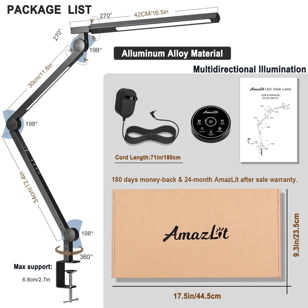 ❤ [Eye-care, Adjustable Brightness & Color Temperature] -- Dual light source provides decent brightness and various color temperature options. Flicker-free and glare-free illumination covers your entire desk area. 5 Brightness levels and adjustable color temperature (from 3000K to 5500K). Ideal for reading, working, thinking, relaxing, drawing, knitting, sewing, hobby, handicrafts, etc ❤ [4 Common Modes, Smart Remote Control] -- According to the usage habits of most people, we have set 4 common lighting modes. Reading Mode, 4000K & 100% Brightness. Relaxing Mode, 3000K & 100% Brightness. Working Mode, 5500K & 100% Brightness. Nightlight Mode, 3000K & 10% Brightness. Convenient remote control allows you full control of the lamp's various functions from anywhere in the room ❤ [Timer Function, Memory Function] -- We have built-in automatic delay-off function in the desk lamp. It can be set to 10 or 40 mins before sleeping, then it will turn off automatically. It is not necessary to worry about getting out of the warm bed to turn off the light. Compatible with wall switches and smart plugs. The light will be on/off instantly when you control the light via wall switch or smart plug. The lamp will return your last setting(mode) when you turn it on next time ❤ [Sturdy Metal Clamp, Flexible Long Swing Arm] -- Extra wide metal clamp comes with silicone pads. Strong clamp supports up to 2.7in/ 6.8cm desktop and holds the swing arm lamp securely in place. Saving space and keeping your desktop clean. With versatile 6-axis design, freely adjustable angles and multiple positions, you can adjust the light direction according to your personal need ❤ [Energy-efficient, What You Will Get] -- Highly efficient 154 LEDs consume 80% less energy than conventional incandescent bulbs and will last a lifetime of 50,000 hours. No need to worry about changing bulbs. 1x Desk Lamp (Material: Aluminum Alloy); 1x Remote Control; 1x UL Power Adapter (Cord Length:71 inches); 1x User Manual. A 180 days money-back and a 24-month worry-free warranty. Any questions, please contact our seller support via Amazon and we will reponse by the earliest time