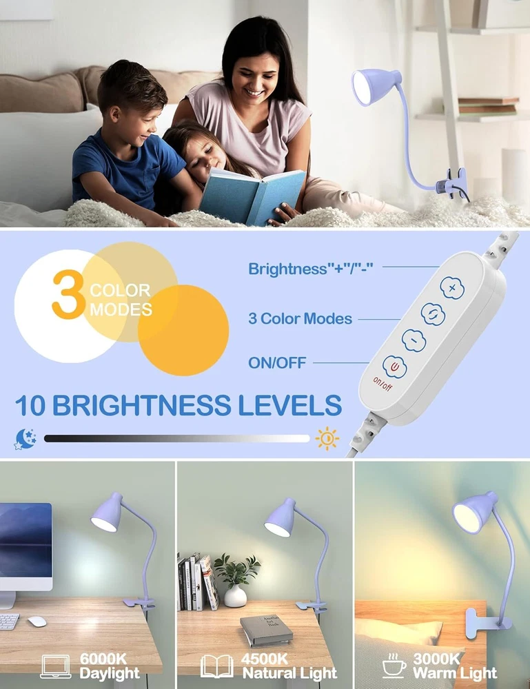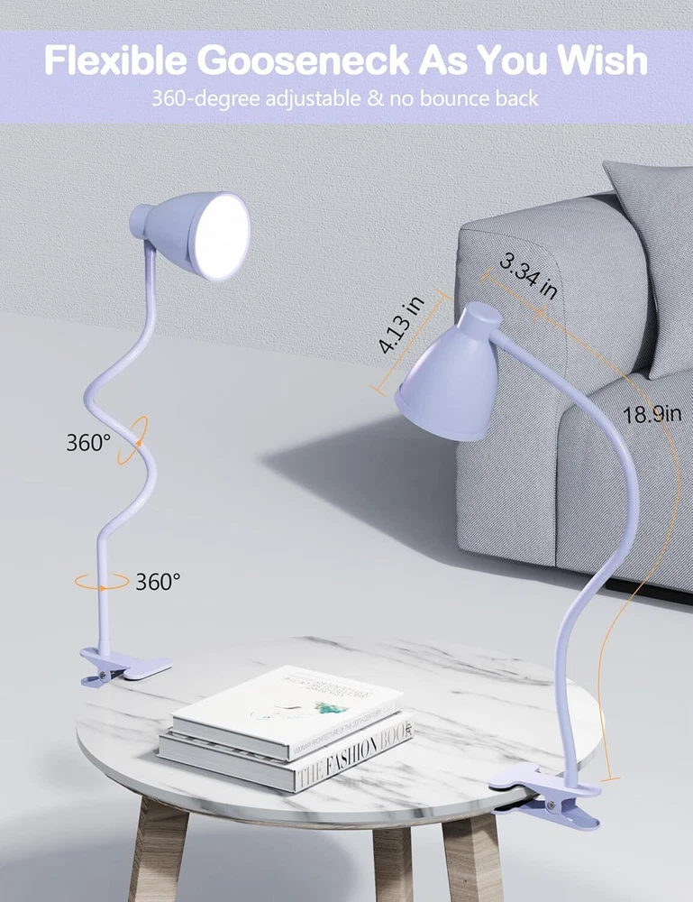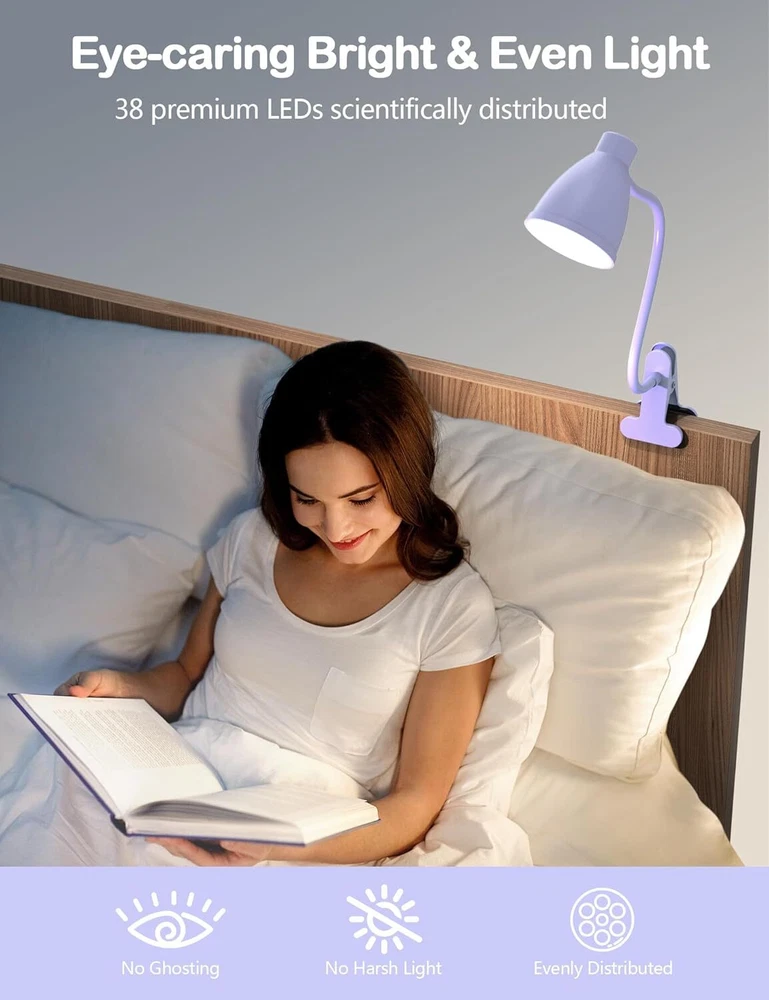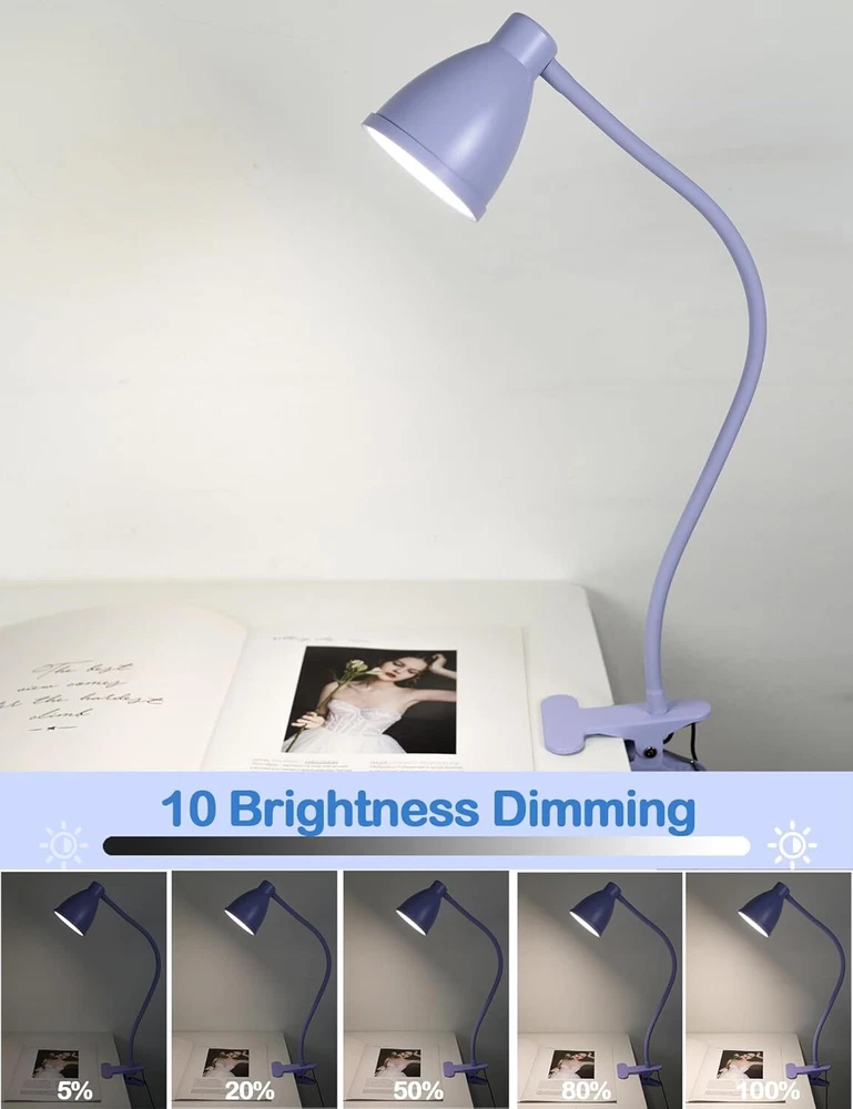 Cute Lilac Purple Desk Lamp: The clamp light featured with 3 color temperature: warm white light (3000K), natural light (4500K) and cool white light (6500K). Each lighting mode has 10 brightness dimming levels. Totally 30 illumination modes to meet all your requirements. The lilac purple lamp is cute desk accessories! Best Lighting Quality and Professional Eye Care: BOHON eye-caring reading light made of excellent 38 LED chips offer non-ghosting and non-flickering light, the book light won't make eyes fatigued even staying in the light for a long time. Designed to help those who read and work hours a day to protect eyesight and reduce eye strain. Clip on bedside or headboard and reading in bed, comfortable light brings you comfortable life! 360° Flexible Gooseneck and Long USB Cord and a reliable UL Listed AC Adapter: Sturdy flexible gooseneck allows you to adjust your clip light with ease and to direct the light wherever you want. Easy to plug the USB cable into any available USB port (laptop/desktop/power bank/USB adapter) to power the lamp. An AC adapter is included, which is UL certified, much safer than some other adapters, be at ease! f an hour