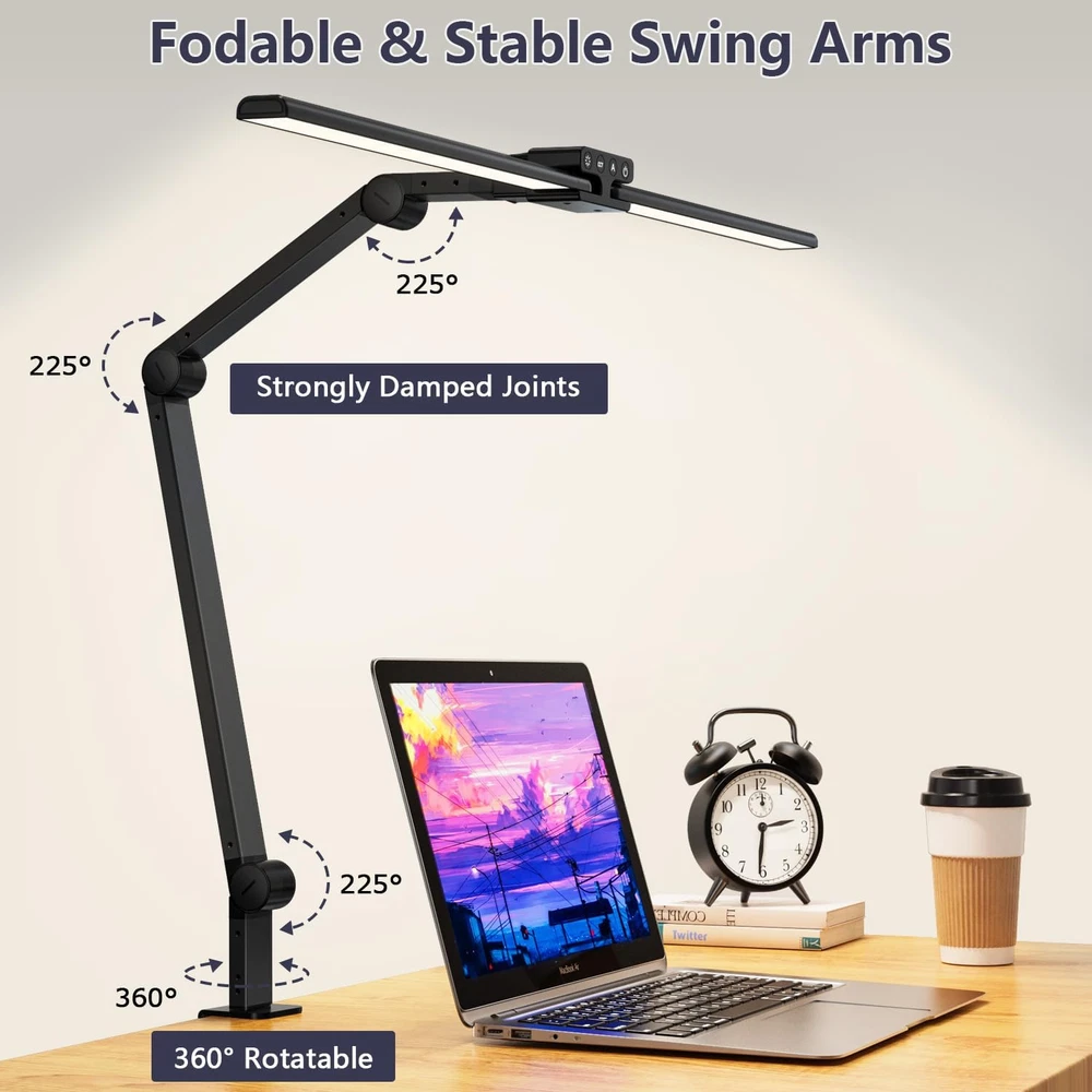 Store New Arrivals Add to Favorite View Feedback Contact Desk Lamp,Double Head Desk Lamp with Clamp,24W Led Desk Lights for Home Office Ultra Bright Architect Table Lamp 4 Brightness 4 Color,Auto Dimming Task Lamp for Monitor Work Study Description Item model number KB-ED-ME Light Source Type LED Style Modern double head desk lamp Number of Items 1 Power Source Corded Electric Number of Light Sources 2 Country of Origin China Bulb Features Dimmable Lighting Method Adjustable Mounting Type Tabletop Lamp Type LED Number of Pieces 1 Room Type Office Installation Type Clamp-onto desk Product Dimensions 2"D x 31.5"W x 27.5"H Material Aluminum Efficiency high Controller Type Touch Finish Type Painted Specific Uses For Product Indoor use only Color Rendering Index (CRI) 95.00 Indoor/Outdoor Usage Indoor Brightness 1000 Lumen Control Method Touch Water Resistance Level Water Resistant Batteries Required? No Item Weight 2.64 pounds Connectivity Technology AC Adapter Special Features 31.5 inch 24W super wide & bright double head desk lamp, Auto dimming mode for the most proper brightness, Fodable and flexible swing arms & 360° rotatable base, 30-min auto off timer, 2.14 inch metal C-clamp takes up no space and no gab between wall Special Feature 31.5 inch 24W super wide & bright double head desk lamp, Auto dimming mode for the most proper brightness, Fodable and flexible swing arms & 360° rotatable base, 30-min auto off timer, 2.14 inch metal C-clamp takes up no space and no gab between wall Part Number KB-ED-ME Shade Color White Color Temperature 6000 Kelvin Color Black Wattage 24 watts Is Cordless? No Base Material Metal Is Waterproof False Shape Desk clamp lamp with double heads Voltage 120 Volts Recommended Uses For Product Reading Shade Material Metal Finish types Painted Base Diameter 2.14 Inches Switch Type Touch 【Super Wide with Double Head】KableRika desk clamp lamp features double head with 31.5inch wide-spanning and 24w super bright lamp bars,make it a perfect light solution to illuminate entire large table or L-shape multi task desk evenly. And it also can be side lamp when the lamp heads arranged together for bright, targeted desk lighting. 【Stable & Foldable Swing Arm Lamp】The table light has 3 strongly damped joints swing arms for freely adjust the lamp over the monitor or bring closer to the work surface for sewing crafting etc. Its powerful support can steadily hold the lamp and won’t fall down. The 360°rotatable base allows the led lamp aim to any direction. 【Easy Operated Front Buttons】The buttons are designed in front of the Led light bar which is easy to see and reach when sitting and smooth to switch the light modes: 4 brightness levels and 4 color modes.【Auto Dimming Mode】Built-in Smart Lighting Sensor it will automatically sense your surroundings and adjust brightness to the most proper level. 【Space Saving Metal Clamp】This tall desk lamp comes with metal C-clamp allows the max desk wide 2.14-inch, it takes up absolutely no desk space and no gab between wall and desk, simple to mount onto desk to accommodate your different lighting needs: clamp onto the back of monitor or side of desk but not get in the way of monitors. 【CRI>95 Eye Caring & 30Min Timer】With high color rendering index LEDs(CRI>95), this office lamp provides constant flicker-free diffused lighting without eye strain, it lights up your work area but no-glare when you're reading on a computer screen. 【30-min auto off timer】long press power button till the light flash twice, the timer activates. Product Description 24W Double Head Desk Clamp Lamp with Swing Arms It has 31.5-inch and 24W ultra bright Led lamp bars, offer 1200LM lighting to illuminate every corner of your desk, the mount and height of this desk light is particularly applicable to fit over the multi-tasks workbench, dual monitors, wide curd monitors but not get in the way of monitors. Multi-Propose OverHead Desk Lamp and Flexible to Clamp-Onto Desk Your Lighting Solution for Home Office Swing Arms with Stable Joints & 360°Rotatable Base Equipped with strongly damped and 225°adjustable joints,make it stable support for lamp heads and flexible for working height (Max 26-inch), the 360°rotatable Base allows it aim to any direction that you want the lighting to. 31.5-Inch Wide Lamp Bar for Larger Coverage It has super wide length when the lamp bars are fully extended which will cover entire large table, and give enough lighting for your working space. Auto Dimming It will automatically sense your surroundings and adjust brightness to the most proper level. Space Saving C-Clamp Sturdy Metal Clamp-on Design takes less Desk Footprint,supports 2.14-inch max desktop thickness. Diffused Lighting Flicker-Free It delivers eye-friendly, and comfortable light that brightens up your desk space and reduces eye strain. 30-Min Auto Off Timer Long press the power buttons till the lamp flashes twice to activate the 30-min auto off timer. Wide Lighting Options, 1200LM Bright Enough KableRika Easy On The Eyes Desk Lamps for Home Office Add to Cart Add to Cart Add to Cart Add to Cart Customer Reviews 4.4 out of 5 stars 233 4.1 out of 5 stars 30 4.4 out of 5 stars 75 4.6 out of 5 stars 404 4.3 out of 5 stars 73 5.0 out of 5 stars 2 Price $46.99 $ 46 . 99 $43.99 $ 43 . 99 $43.99 $ 43 . 99 $39.99 $ 39 . 99 — — Power 24W 24W 12W 12W 12W Max 40W Lamp Bar 31.5-In double head desk lamp 31.5-In double head desk lamp 27-In double head desk lamp 27.8-In double head desk lamp 17-Inch wide desk lamp 3* E26 bulbs (not included) Lamp Pole foldable and stable swing arm foldable and stable swing arm highly flexible gooseneck highly flexible gooseneck highly flexible gooseneck tall standing pole Max Working Height 26-inch 23.2-inch 26.6-inch 24.6-inch 24.6-inch 67-inch Base Type 2.17-inch metal c-clamp Metal sturdy base Metal sturdy base 1.7-inch separated c-clamp 1.7-inch separated c-clamp sturdy metal base ABOUT US We offer the best prices around 