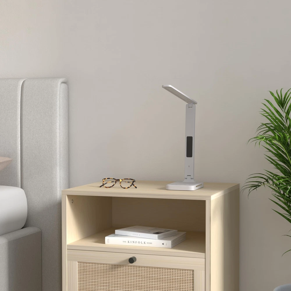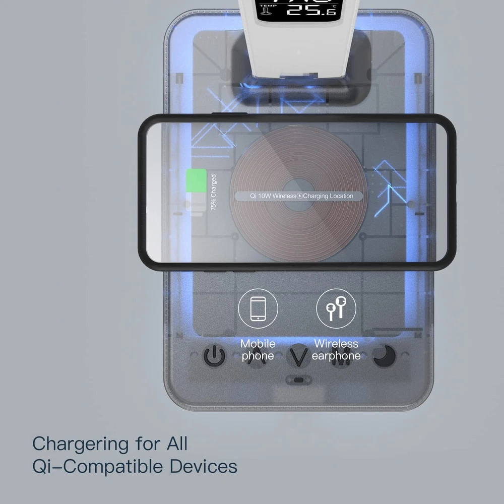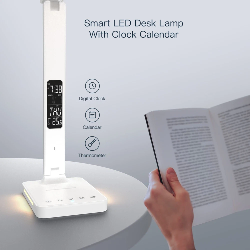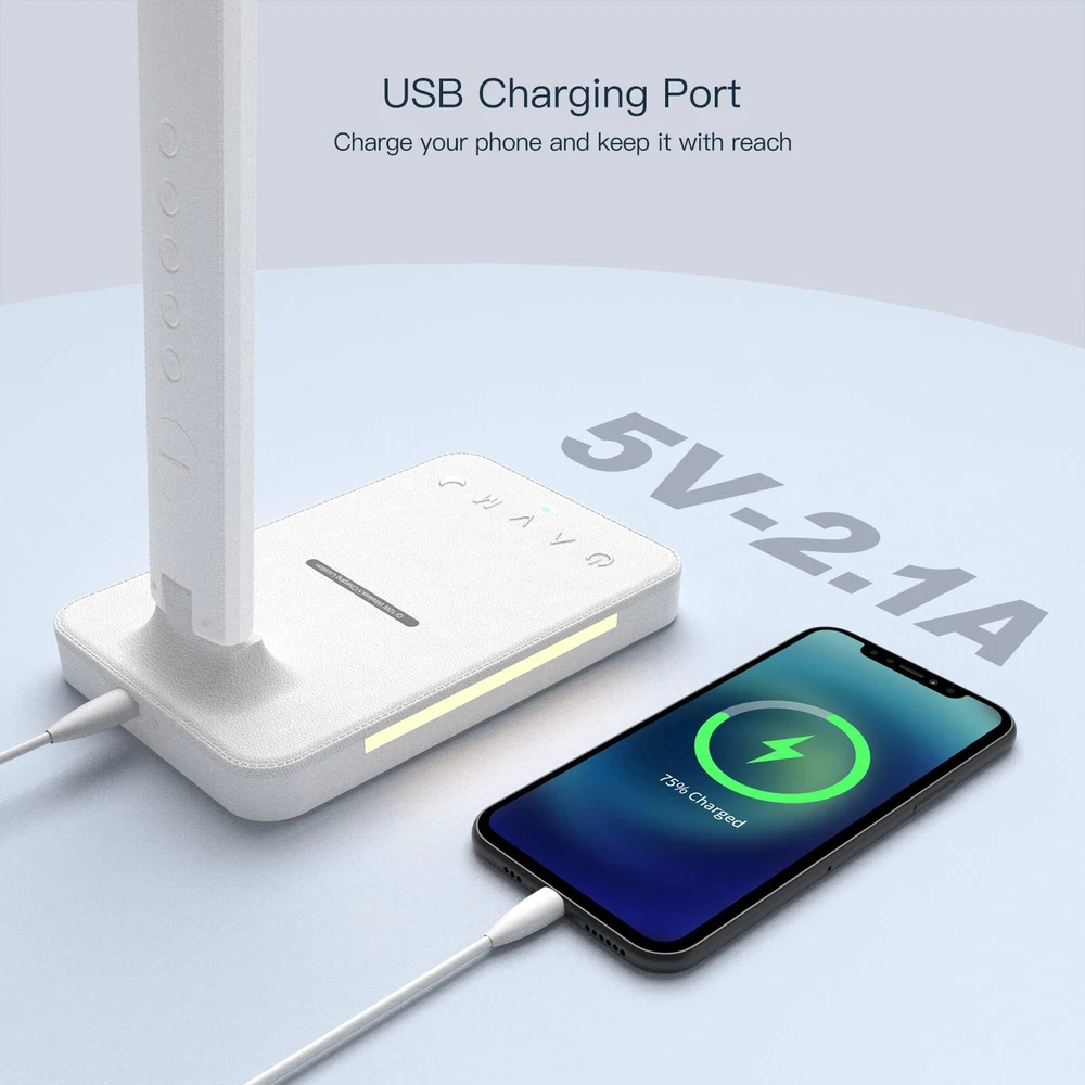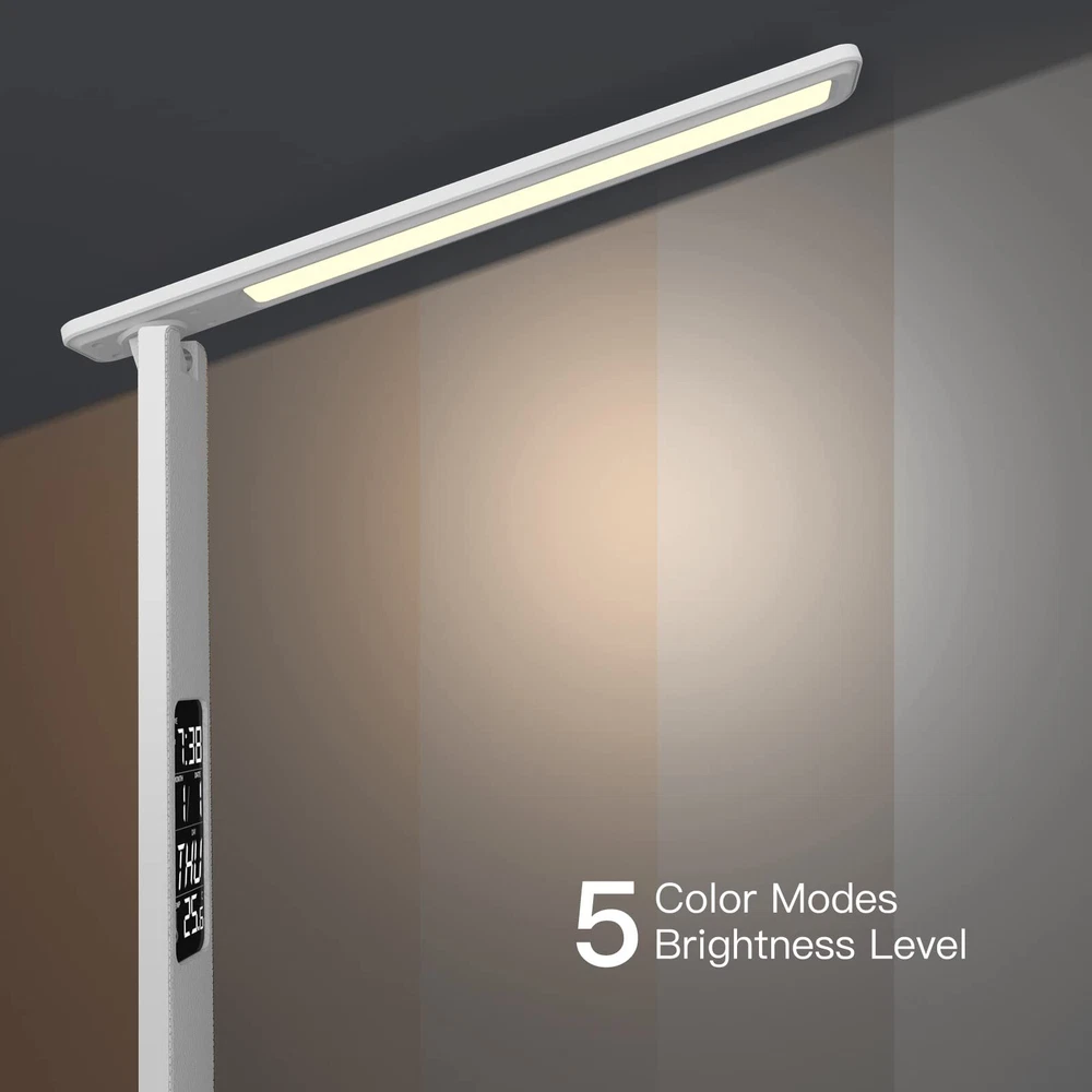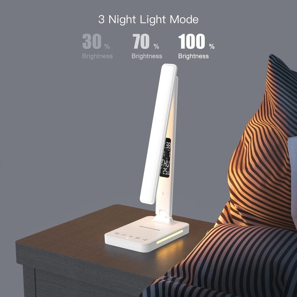 Digital Alarm Clock Display: Desk light desk lamp with wireless charger You will get the most clean and tidy working environment when you use this have digital alarm clock, calendar and temperature detect function desk lamp. Wireless charger and USB Charging Port: You will get two charging options for 10W wireless charging and 5V/2.1A USB charging port. Adjustable lighting: 5 color mode and 5 light levels to meet the needs of different occasion. Such as school, workshop, studio, home and office. Unique Night lights: The night light function is individually controlled to easily cope with various sleeping habits. Enjoy your bedtime story time with your kids. Fold able design: LED desk lamp can rotate the head 180 degrees and 90 degrees base axis. Save your desk space and you can carry it anywhere to use.