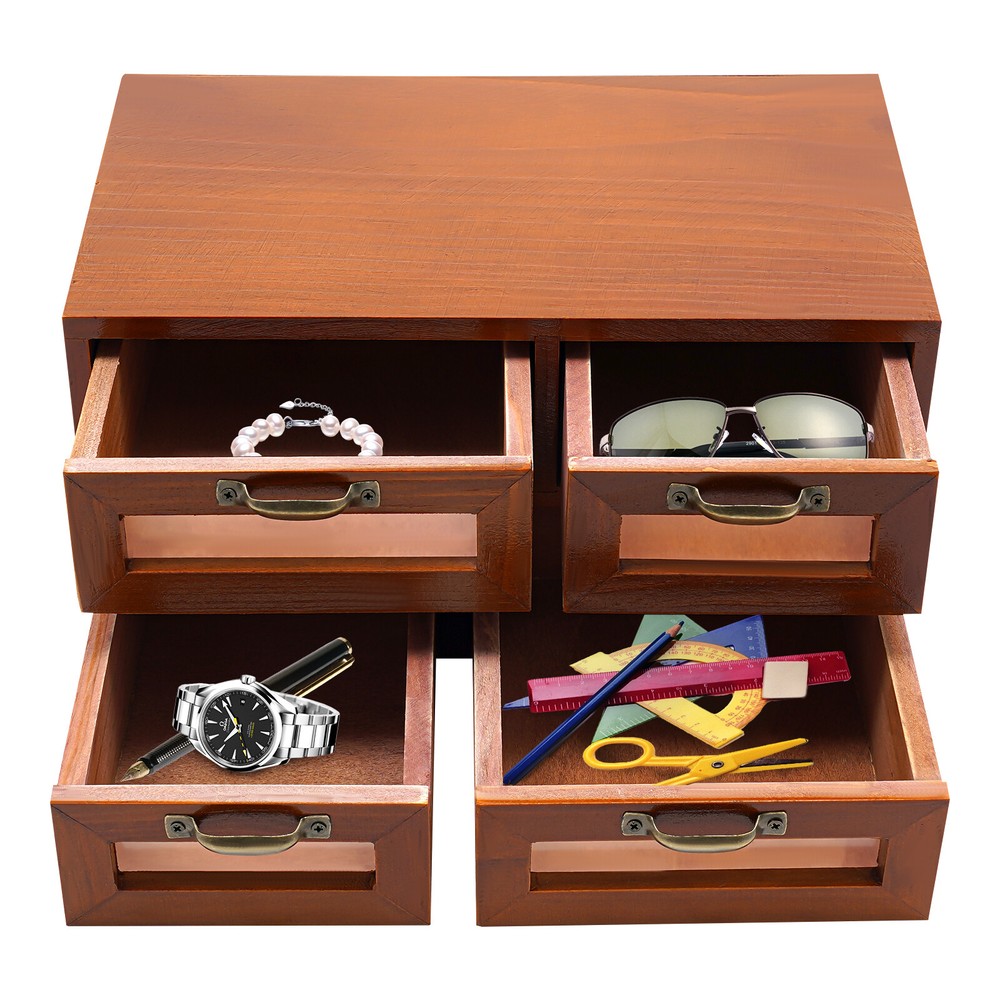 Package Included 1* Desktop Organizer 4* Drawers Specification Color: Dark Brown Style: Retro Shape: Rectangle Mount Type: Tabletop Material: Solid Wood, Plastic, Iron Assembly Required: No Number of Drawers: 4 Total Load-bearing Capacity: 4kg/8.82lbs Gross Weight: 1.8kg/3.97lbs Net Weight: 1.5kg/3.31lbs Large Drawer Width: 15cm/6in Small Drawer Width: 12cm/4.7in Package Size: 33*21*18cm/12.99*8.27*7.09in Overall Product Size: 30*18*15cm/11.8*7*6in 🌞🌞🌞 Welcome to Interview888 🛒🛒🛒 Application It can be placed on the dresser to store necklaces, earrings, bracelets, rings, crystals, cosmetics, perfumes, and lipstick, placed in the kitchen to store teabags, espresso coffee pods, sugar packets, placed in the living room to organize medicine, keys, watches, receipts, credit cards. It is also an office organizer to store electronics, small cords, chargers, batteries, pens, letters, staplers, and pictures. It is ideal for craftsmen to organize sewing pins, buttons, tool bits, and small precision tools. Package Included 1* Desktop Organizer 4* Drawers Specification Color: Dark Brown Style: Retro Shape: Rectangle Mount Type: Tabletop Material: Solid Wood, Plastic, Iron Assembly Required: No Number of Drawer s: 4 Total Load-bearing Capacity: 4kg/8.82lbs Gross Weight: 1.8kg/3.97lbs Net Weight: 1.5kg/3.31lbs Large Drawer Width: 15cm/6in Small Drawer Width: 12cm/4.7in Package Size: 33*21*18cm/12.99*8.27*7.09in Overall Product Size: 30*18*15cm/11.8*7*6in Description Do you feel annoyed by too many items on your desktop that are cluttered and unorganized? Our desktop organizer can help you solve this problem. It is made of high-quality material which ensures a long service life. The 4 drawers are convenient for you to organize different daily items. The handle makes it convenient for you to open the drawer. In a word, it can effectively help you reduce the pressure on your countertop, which is an ideal choice for you. Key Features Build to Last: The solid wood and plastic make it strong, hard to deform, resistant to corrosion, and environmentally friendly, so it can be used for a long time. Storage Assistant: 4 drawers allow you to organize and store cosmetics, jewelry (all are not included), and more. In addition, the top platform allows you to place toiletries, books (all are not included), etc., making your items neat and orderly. Retro Appearance: The dark brown color presents a retro style, adding beauty and vintage elements to your room. It plays a unique decorative role while using, bringing an old-world charm into your new-world home. Stable Construction: The thickened material and rectangular structure give it excellent stability and make it capable of supporting a weight of 8.82 lbs, meeting your needs for storing various items without tipping over. Effortless Cleaning: Thanks to the smooth surface and simple construction, you can easily wipe off the dirt on it with a soft cloth. Compact and Lightweight: The product is compact (11.8*7*6in) and lightweight (3.31 lbs), so you can effortlessly carry it or conveniently place it on various tabletops. Thoughtful Gift: This is an ideal gift for colleagues, friends, and family to help them organize their belongings and keep their desks tidy. Protective Package: To prevent the product from being damaged during transportation, we packed it with bubble bags to protect your products to the maximum extent possible. Good Customer Service: We stand behind all our guests and look forward to assisting you with your purchase. It is our pleasure to answer your confusion and questions. The end of the story between us is not "we sell and you buy". Details Convenient Handle: The iron handle is durable and makes it convenient for you to open the drawer. Smooth Edge: The rounded and smooth edges not only add to the aesthetics of the product but also improve the safety of use. Notes Please note that this product does not include any other items. Please check the size carefully before ordering. Please do not place it in a damp place or near an ignition source. Please allow the slight color difference caused by the shooting light and the 1-3 cm error due to manual measurement, and make sure you do not mind before ordering. Payment Delivery details Terms of sales About us Contact us Payment We accept ebay payment 。 Fees such as import duties, taxes are not included in the item price or shipping costs. These charges are the buyer's responsibility. Delivery details Shipping: 2-9 working days to: USA Terms of sales We maintain high standards of excellence and strive for hundred percent customer satisfaction. Feedback is very important to us. We hope that you contact us immediately before you give neutral or negative feedback, so that we can address your concerns. It is impossible to address issues if we do not know about them! About us Your satis faction is our ultimate goal. We work hard to earn your trust and future business. Our certified technicians have tested each item before shipping. The unit comes with 1 year limited warranty on all manufacturing defects. a) If you receive a defective item, you may return it or ask for a discount. Please contact us within 14 days after you receive the package. b) What you returned must be intact and in its original packaging as re? u. Customer is responsible for shipping costs of the returned item. c) We will cover the cost of shipping back t with the shipping rate indicated in the registration page. We will send you a new unit or refund the full payment you paid. Thank you. Contact us Business Hour Business Hour: Monday To Friday: 8:30 AM to 5:00 PM (Beijing China time) Due to time zones, our reply to your questions may not be immediately. But within above working time, we will reply your email within 24 hours. If it's non-workdays, please kindly be patient and wait till Monday. Please contact us with ebay message. Please feel free to contact us if you have any questions. Monday To Friday: 8:30 AM to 5:00 PM (B