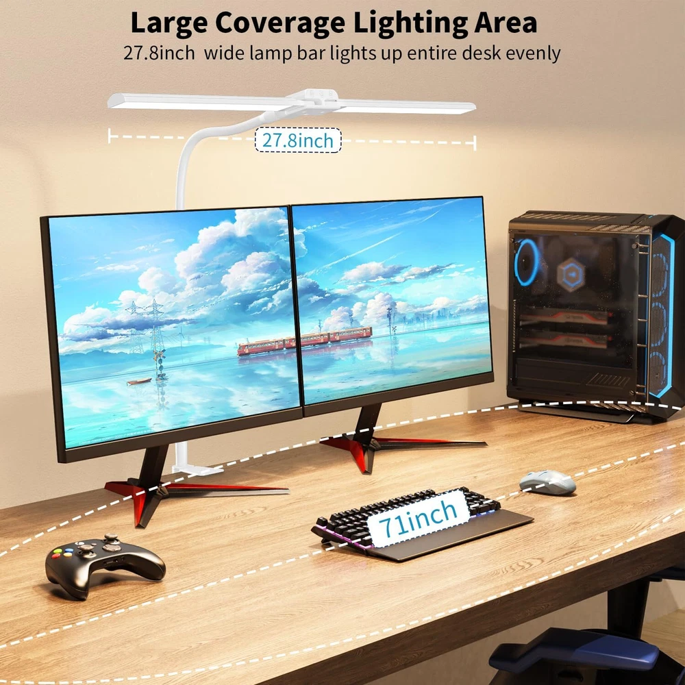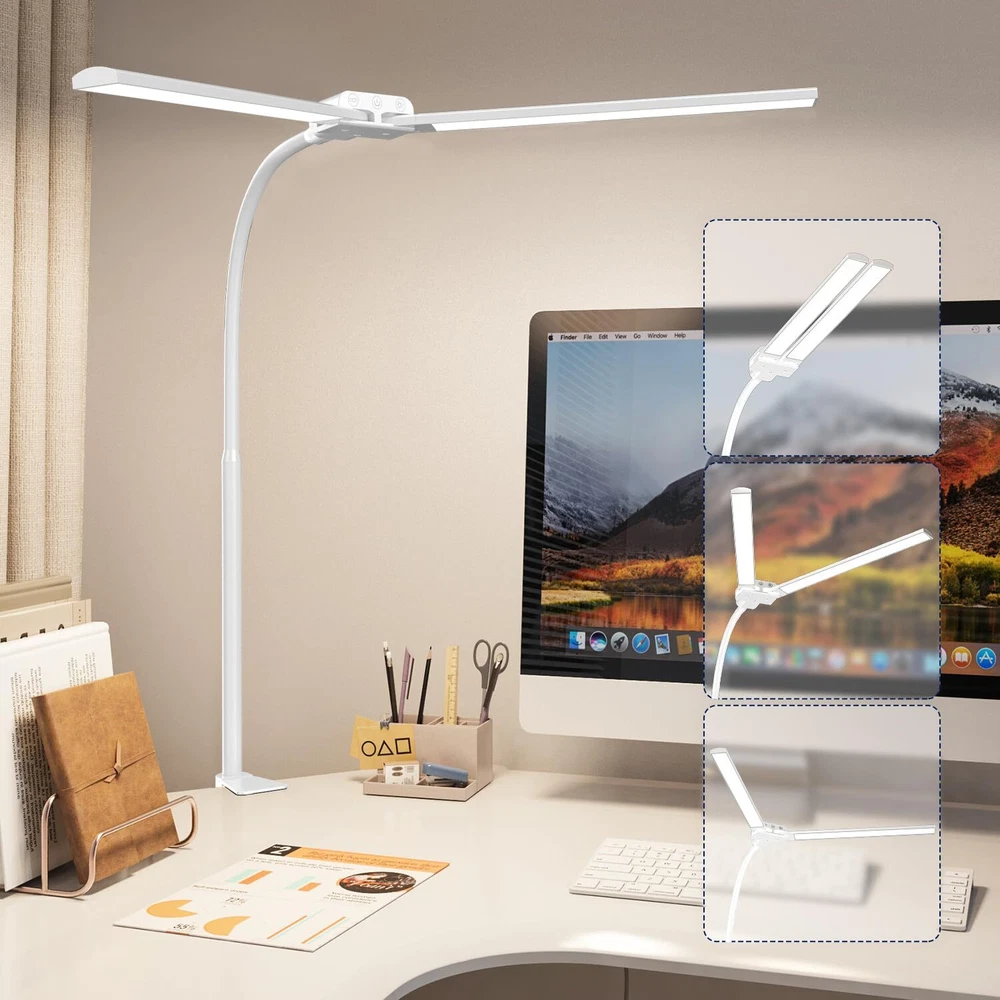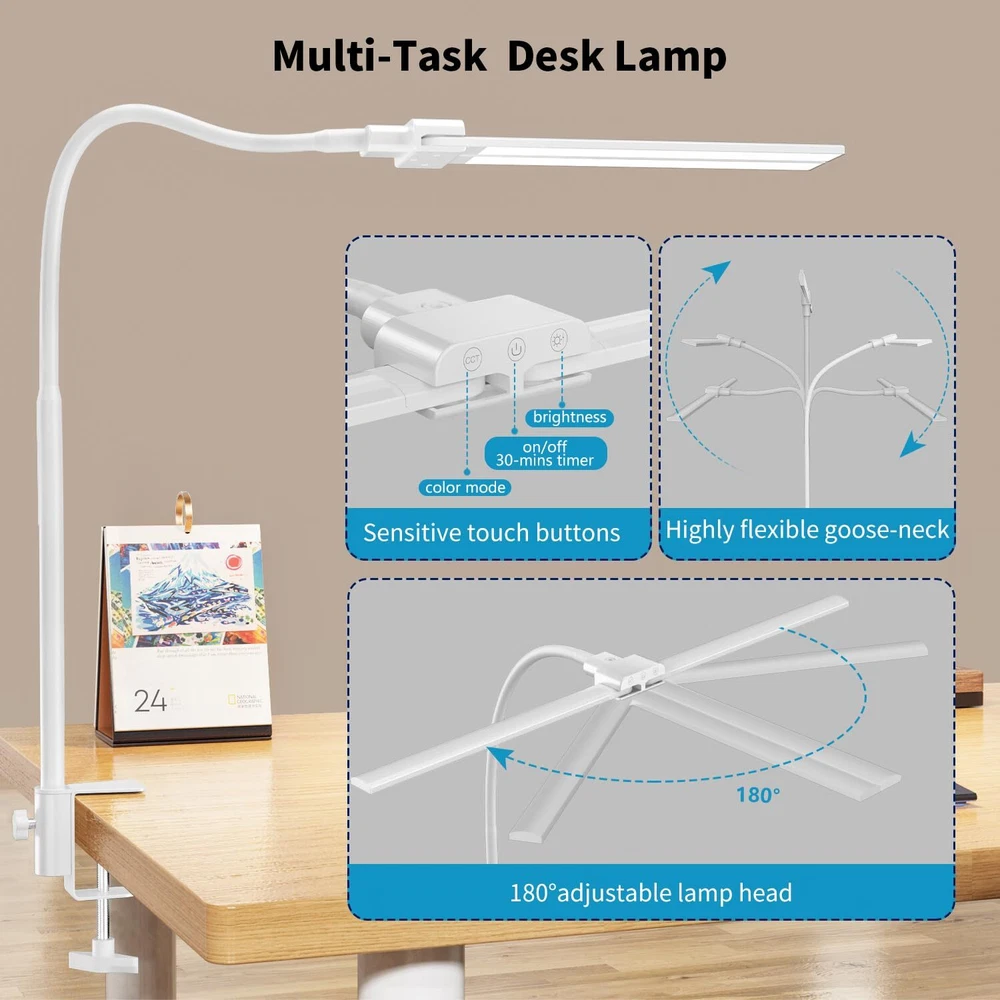 【Double Head Desk Lamps for Home Office】The LED lamp bars are 180°adjustable, it has ultra wide-spanning 27.8-inche across when unfold that achieves the full desk coverage evenly, ideal for dual monitors, cured wide monitors or L-shape desk. And it also can be side lamp when the lamp heads arranged together for bright, targeted desk lighting. 【Space Saving Separated C Clamp】This tall desk lamp comes with a separated C clamp allows it clamp-onto the max desk wide 1.7-inch and it takes up absolutely no desk space, the separated design allows the lamp mounted from any direction to accommodate your different lighting needs,the great solution for working from home. 【Easy Operated Front Touch Buttons】The buttons are designed in front of the light bar which is visible when sitting at the table and smooth to switch the light modes: 4 brightness levels and 4 color modes. It also equipped with 【30-min auto off timer】long press power button till the light flash once, the timer activates. 【Highly Flexible Goose-Neck】Its l long goose-neck supports flexible working height up to 24.6-inche, which can hold the lamp heads over the monitor or bring closer to the work surface, it casts enough light for you to see what you’re working on clearly. 【Easy on the Eyes Soft Lighting】The desk clamp lamp provides constant flicker-free diffused lighting without eye strain, it lights up your work area but not get in the way of monitors and no-glare when you're reading on a computer screen. Please feel free to contact customer service with any questions or concerns.