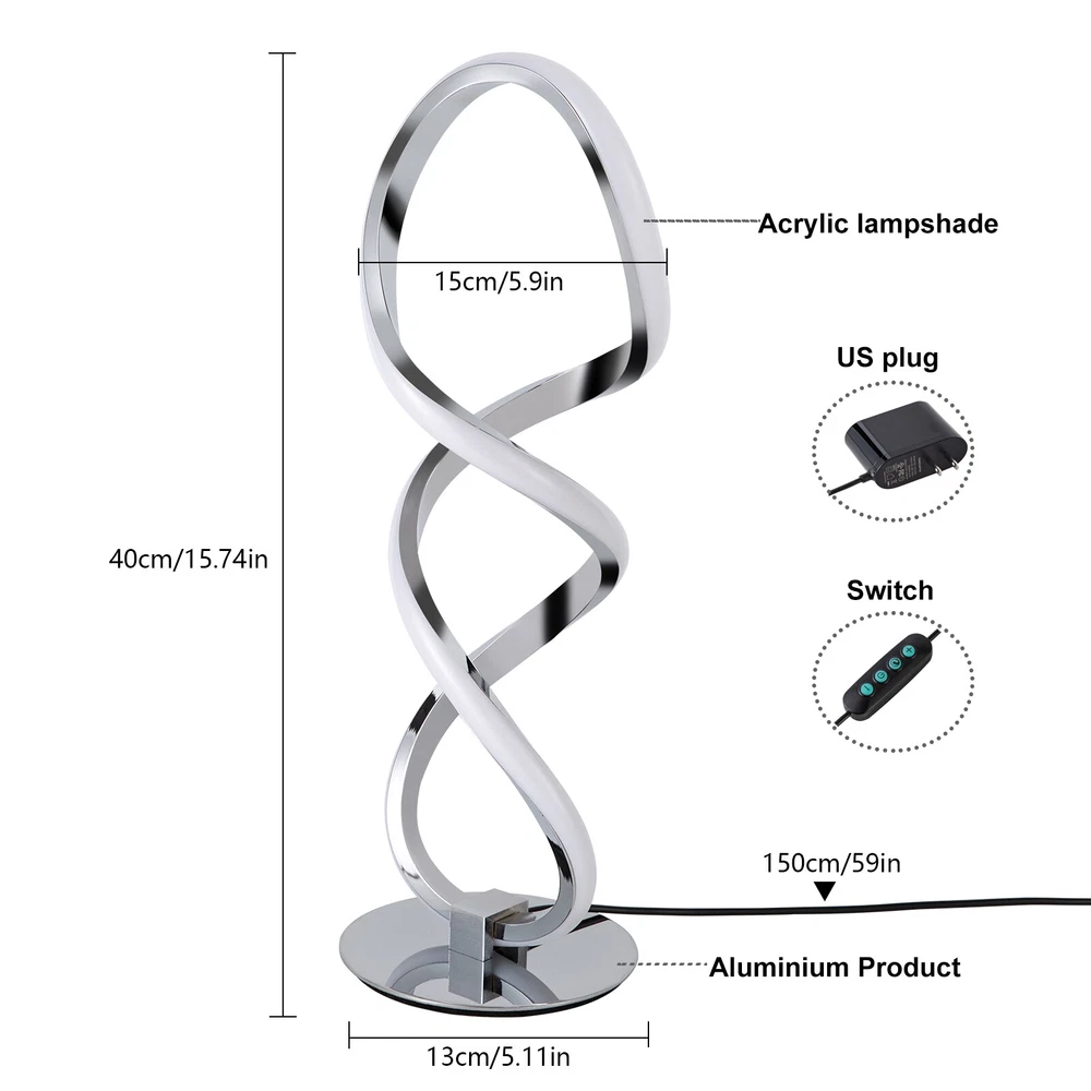 ❤❤❤Welcome to royalfeatured ❤❤❤ Description This table lamp is made of aluminum and iron materials, which are well-crafted, rust-proof, and sturdy. The spiral design will create an ultimate aesthetic living space for you. Crafted with attention to detail, it is not only functional but also serves as a piece of art. This unique and pleasing lamp will add a unique delicacy and beauty to your life, it's a great choice for those seeking a touch of charm in their bedroom. Key Features Build to Last: This table lamp is made of aluminum and iron with an electroplating process, which is strong, rust-proof, and durable, and remains beautiful and practical after long-term use. Fashionable Appearance: The appearance of the spiral trophy symbolizes victory and hope, making it a great decoration that can be incorporated into different décor styles to add color to your room. Embrace Elegant Atmosphere: The high-gloss electroplated surface mirrors the light, thus making your room more romantic, beautiful and luxurious. The high-quality spiral lampshade reflects the light from many angles and has a full design sense. Excellent Light Source: The environment-friendly and energy-saving LED light with a high color rendering index( >85) can effectively avoid glare and stroboscopic, protect your eyes, restore the most authentic color of objects, and save your costs. Carefully Designed: The color temperature (3000K-6500K), and warm, neutral, and white light colors fully meet your usage needs in different scenarios, making it more versatile. Easy to Use: This product comes with a driver plug, which can be used by simply connecting it to the power supply without the need for installation. You can press the button on the regulator to adjust the on/off and light color, which is convenient. Space-saving: The compact size (5.9*15.74in) makes it ideal for placing on any tabletop without taking up too much space. Effortless Cleaning: It has a simple structure and a smooth surface. When dust accumulates, you only need to use a towel to clean it. Ideal Gift: The product combines practicality and beauty, making it ideal for housewarming or birthday gifts for your family, loved ones, friends, and children. Details Extended Power Cord: The 59-inch length of the power cord is convenient to use, allowing you to power it easily. Anti-slip Base: It ensures stable support for this product without easily wobbling and avoiding scratching the desktop. Application It is suitable for lighting and decoration in bedrooms, dining rooms, study rooms, living rooms, balconies, clothing stores, tea houses, cafes, hotels, etc., or on the bedside, end tables, working tables, and more. Specifications Model: RJ0801 Color: Silver Style: Modern Material: Aluminum, Iron Indoor/Outdoor Usage: Indoor Controller Type: Hand Control Control Method: Push Button Switch Process: Electroplating Light Source: LED( Included) Assembly Required: No Bulb Power: 10W Lamp Type: Table Lamp Power Supply: Wired Electricity Efficiency: E Batteries Required: No Color Rendering Index: >85 Light Color: White Light, Warm Light, Neutral Light Color Temperature: 3000K-6500K Plug Type: US Standard Voltage: 100-240V Power Cord Length: 150cm/59in Spiral Interval: 15cm/5.9in Product Height: 40cm/15.74in Base Diameter: 13cm/5.11in Package Included 1* Table Lamp 1* Driver Plug Notes This product is not waterproof, please place it in a dry environment. Please disconnect the power before cleaning the shade or fixture. Please allow the slight color difference caused by the shooting light and 1-3cm error due to manual measurement, and make sure you do not mind before you order. Payment Delivery details Terms of sales About us Contact us Payment We accept ebay payment 。 Fees such as import duties, taxes are not included in the item price or shipping costs. These charges are the buyer's responsibility. Delivery details Shipping: 2-9 working days to: USA Terms of sales We maintain high standards of excellence and strive for hundred percent customer satisfaction. Feedback is very important to us. We hope that you contact us immediately before you give neutral or negative feedback, so that we can address your concerns. It is impossible to address issues if we do not know about them! About us Your satis faction is our ultimate goal. We work hard to earn your trust and future business. Our certified technicians have tested each item before shipping. The unit comes with 1 year limited warranty on all manufacturing defects. a) If you receive a defective item, you may return it or ask for a discount. Please contact us within 14 days after you receive the package. b) What you returned must be intact and in its original packaging as re? u. Customer is responsible for shipping costs of the returned item. c) We will cover the cost of shipping back t with the shipping rate indicated in the registration page. We will send you a new unit or refund the full payment you paid. Thank you. Contact us Business Hour Business Hour: Monday To Friday: 8:30 AM to 5:00 PM (Beijing China time) Due to time zones, our reply to your questions may not be immediately. But within above working time, we will reply your email within 24 hours. If it's non-workdays, please kindly be patient and wait till Monday. Please contact us with ebay message. Please feel free to contact us if you have any questions. Monday To Friday: 8:30 AM to 5:00 PM (Beijing China time) Due to time zones, our reply to your questions may not be immediately. But within above working time, we will reply your email within 24 hours. If it's non-workdays, please kindly be patient and wait till Monday. Please contact us with ebay message. Please feel free to contact us if you have any questions. Brand Unbranded Type Bedside Lamp Material Aluminum, Iron Room Bedroom Style Modern Sensor Type N/A Color Silver Finish N/A Lighting Technology LED Number of Settings 1 Power Source Wired Electricity Shade Shape N/A Theme N/A Character Family N/A