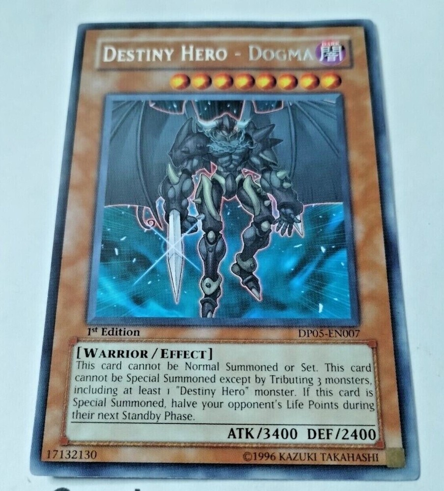 Features:1st EditionCreature/Monster Type:Warriorbrand:KonamiAttack/Power:3400Defense/Toughness:2400Card Type:EffectLanguage:EnglishRarity:RareAdditional Description:Destiny HERO - DogmaLevel:8Attribute/MTG:Color:DarkGame:Yu-Gi-Oh! TCGManufacturer:KonamiSet:- Aster Phoenix -Card Name:Destiny HERO - DogmaCard Number:DP05-EN007Card Text:This card cannot be Normal Summoned or Set. This card cannot be Special Summoned except by Tributing 3 monsters, including at least 1 Destiny Hero monster. If this card is Special Summoned, halve your opponent''s Life Points during their next Standby Phase.