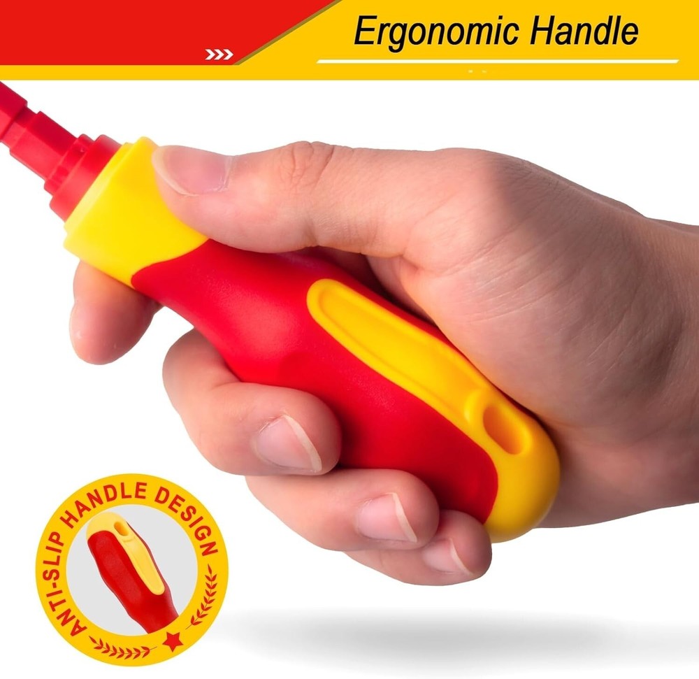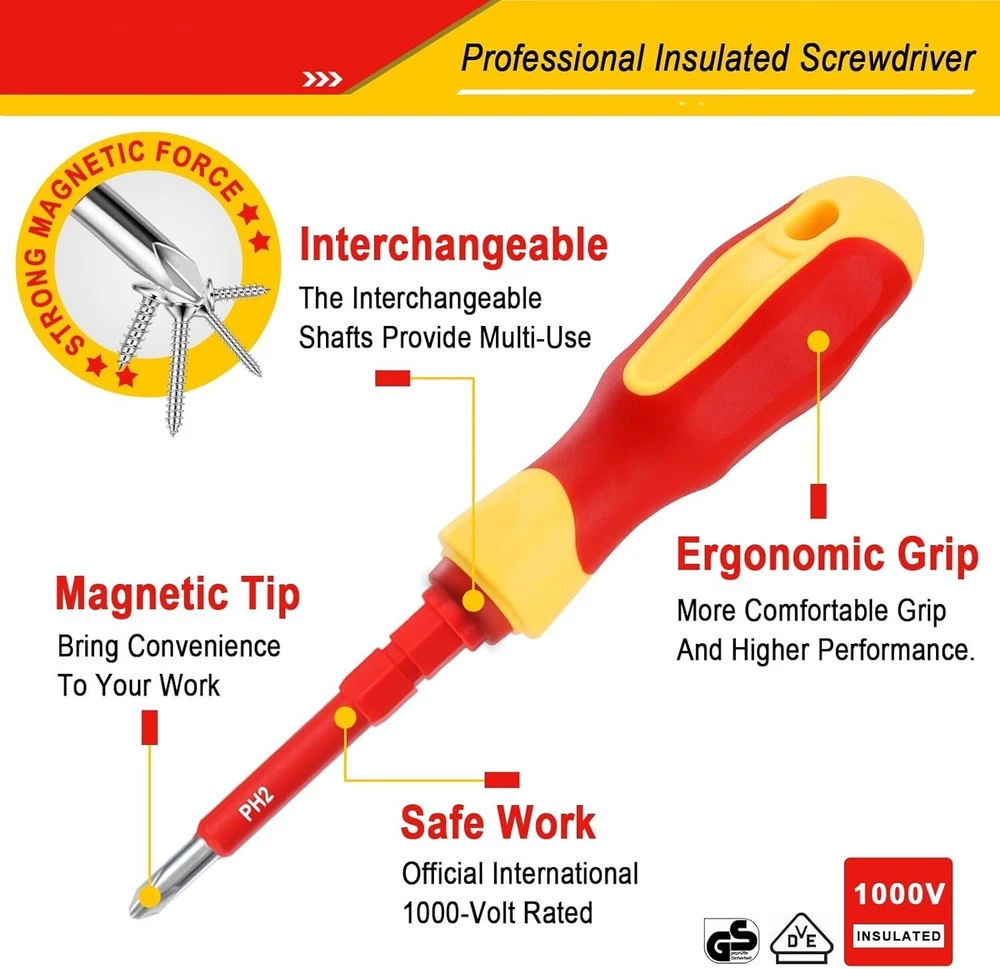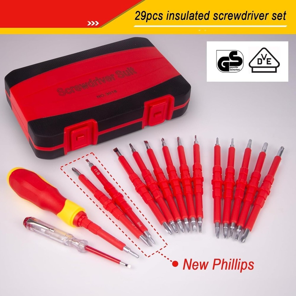 Destornilladores Aislados 1000V Herramientas Para Electricistas Electricidad Set Juego de destornilladores 29 en 1: Incluye caja de almacenamiento y 14 hojas intercambiables: 4 cuadradas, 5 ranuradas, 5 Phillips, 5 Torx, 2 en forma de U, 2 triangulares, 2 tipo Y, 3 hexagonales, 1 comprobador de voltaje y 1 mango extraíble. Certificado de seguridad: El material aislante y el estándar de aislamiento de 1000 V han sido certificados por VDE y GS. Destornilladores aislados que garantizan su seguridad. Juego de destornilladores magnéticos: Todas las puntas de los destornilladores están hechas de acero al cromo vanadio y tratadas magnéticamente para lograr una mayor dureza y un magnetismo más fuerte, adecuadas para trabajos de electricistas profesionales y proyectos de bricolaje en el hogar. Cómodo de usar: El mango ergonómico lo hace más cómodo durante un uso prolongado. Los destornilladores se insertan con precisión en la ranura del mango, sin preocuparse de que la hoja se afloje o se caiga, lo que aumenta la seguridad durante el uso. Ampliamente utilizado: Ya sea que trabaje en campos eléctricos, el automóvil, el barco o en proyectos domésticos, este juego de destornilladores aislados le ofrecerá la precisión que necesita. El mejor regalo para esposos, padres, artesanos y metalúrgicos.