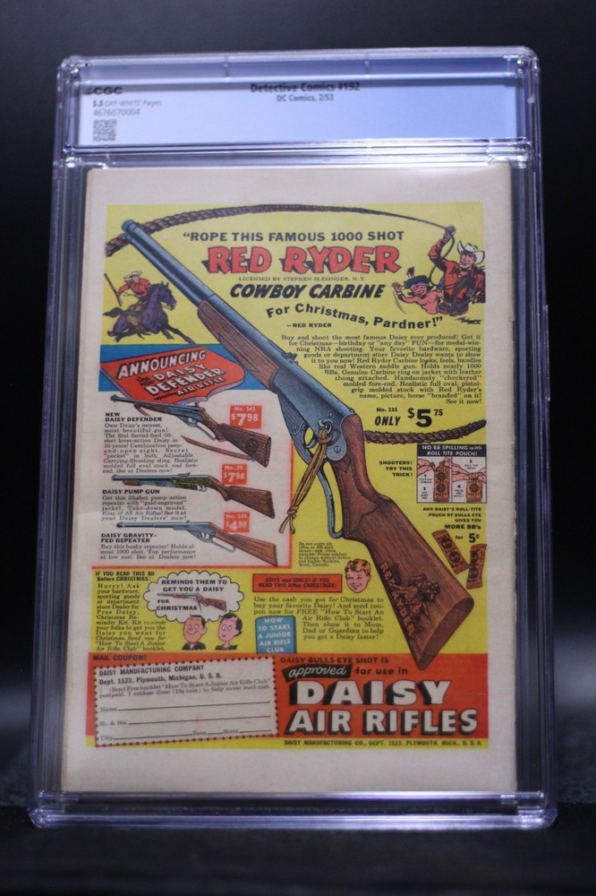 Link to our BEST items!! Link to our ENDING items!! Link to our FAQ page !! Link to our NEWEST items!! Item: Detective Comics (1937) #192 Win Mortimer Batman & Robin CGC 5.5 Off-White Pages Special Notes: This issue is a First Printing! We do not use stock photos! What you see in the pictures is what you will be getting. Publication Date: Feb 1953 (The date in the title refers to the year the title started) Writer : David Vern? Interior Artist: Bob Kane Cover Artist: Winslow Mortimer Condition: CGC 5.5 Fine - Page Quality: Off-White Pages Bar Code: 4676070004 SHIPPING: All pricing is based on the weight of the package and your location. Package Weight: 3 lb[s] Package Size: 14x12x6 We charge exact shipping costs per USPS with NO handling charge. You can check our shipping quotes on the USPS website. For the convenience of the winner, we offer shipment via Priority Mail or Media Mail, when shipping to an address inside the USA. For International Winners, we offer Priority Mail International or First-Class International Mail. Please click on the "SHIPMENTS and PAYMENTS" tab above for more details. * FREE Insurance, for items totaling under $100.00, is only available when shipping with USPS Priority to an address within in the USA! All packages will have a tracking number sent to the winner! Shipping & Payment Terms: If you would like to have your item insured, please contact us and we will send you an invoice with the adjusted shipping charges. We will be happy to combine the shipping charge for multiple auction wins . If you win a single item, you do not have to wait for an invoice to make your payment. IF YOU WIN MULTIPLE AUCTIONS, PLEASE WAIT UNTIL WE SEND YOU A COMBINED INVOICE BEFORE PAYING FOR YOUR ITEMS. Please DO NOT pay for items separately. We will ship your items within 2 business days upon receiving your payment. Payment Options: PayPal is the preferred method of payment per eBay's policies. If you do not have a PayPal account, we do accept credit card payments over the phone. Payment MUST be received within 7 business days of the auction ending or your bid will be cancelled and eBay will be contacted. Questions: We will be happy to answer any questions you have about our items before the auction ends. Please ask your questions as early as possible so we have plenty of time to answer them. Return Policy: All returns MUST be approved by Duncanville Bookstore. If there is a problem with your order, please give us a chance to address the issue before you leave negative feedback and/or contact PayPal for a refund. Store Info: Please check our other auctions and our eBay store for more great deals!! Check out our info page for more great ways to get in touch with us. Also, feel free to contact us if you are looking for anything in particular or you are looking to sell your items. We are always buying!! Duncanville Bookstore is open 7 Days a Week 10am-7pm CST!!