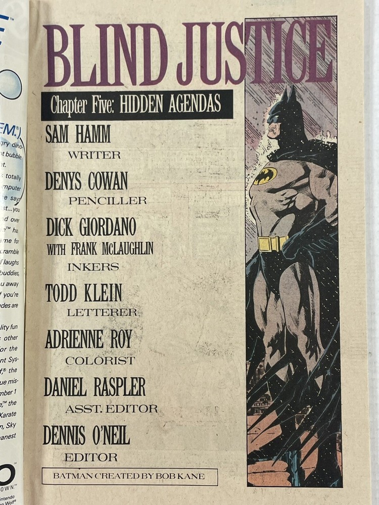 Series Title:Detective ComicsGenre:SuperheroesArtist/Writer:Denys Cowan, Sam Hamm, Adrienne Roy, Dick Giordano, Frank MclaughlinCover Artist:Denys Cowan, Malcolm Jones IIIEra:Copper Age (1984-1991)Tradition:US ComicsLanguage:EnglishCharacter:Bonecrusher, The Spirit, Jeannie Bowen, Robin (Dick Grayson), Penguin, Two-Face (Two-Face), Batman (Bruce Wayne), Joker (Flashback), Tweedledee, Alfred Pennyworth, Two-Face (Harvey Dent) (Flashback), Catwoman, Joker, Tweedledum, Mad Hatter, Other Rogues Gallery, Roy Bowen (As Batman) (Death), Scarecrow (Dr. Jonathan Crane), Thomas Wayne (Flashback), Roy Bowen (As Batman), Riddler (Edward Nigma) (Flashback), Sergio Aragonés, Martha Wayne (Flashback), James Gordon, Riddler, Roy BowenPublication Year:1989Issue Number:600Features:DirectGrade:9.4 Near MintPublisher:DC Comics