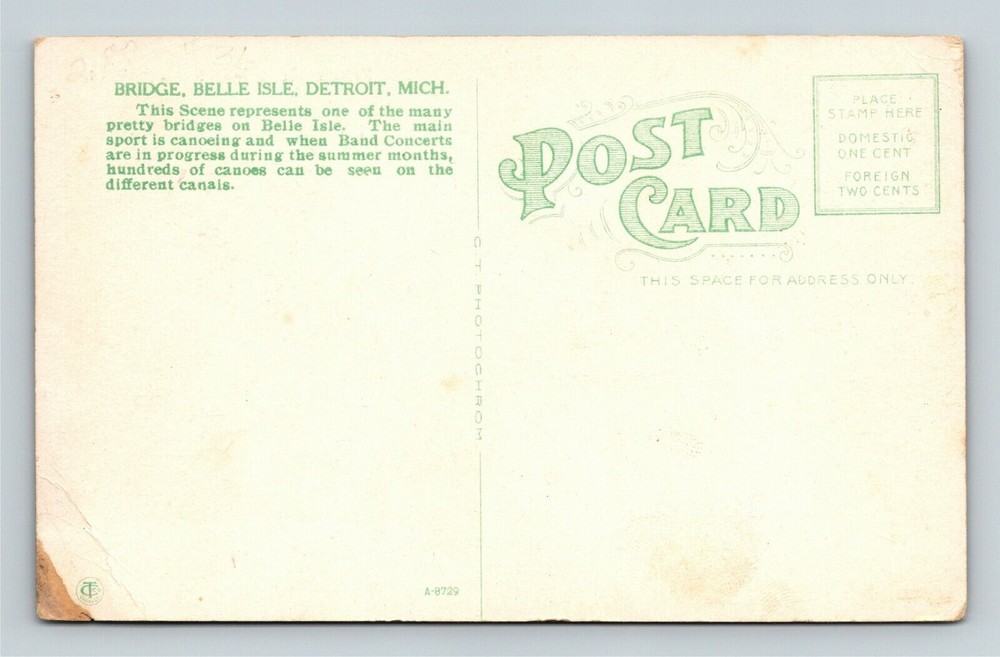 This charming vintage postcard captures the timeless beauty of Detroit’s Belle Isle Bridge and Canal, featuring a Victorian lady in a canoe—a nostalgic glimpse into the past. The standard 3.5x5.5 size is perfect for collectors, and the seller offers affordable shipping options. A must-have for postcard enthusiasts!