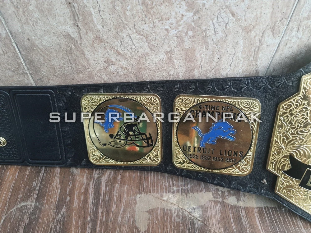 Welcome to our shop ------------------------------------------- We are specialist in manufacturing handmade products:: Our wide range of products include: >>>>Championship Belts WWE | WWF | AEW | UFC | WBC | WCW Product Description ** Detroit Lions Championship Belt 2mm Brass *** Plate Metal: Brass (Zinc available on request with additional cost) Strap: 100% Leather Largest Waist Size: Fits upto 46'' Belt Length: ~50" Weight: 4.17 lbs | 1.81 Kg Plate Thickness: 2mm (4mm Version available on demand with additional cost) ::The belt is well crafted and manufactured to meet the quality demands of fans:: Get your hands on this marvelous piece now! Note: If you need further details kindly inbox us, we will try to be as responsive as possible. ------------------------------------------- Return Policy: Generally we don't have much complains on our products and we make sure to 100% satisfy our clients. We send the product in well Bubble Wrapped packaging so there is highly unlike chance of getting damaged item. In case there is a damage, we will try to give partial refund or you can ask for full refund within 30 days after returning the belt to origin. NOTE: 1. If you have placed the order by mistake or you have purchased a wrong item then we are not going to refund that. 2. Buyer will pay the shipping fee of returning the belt. ------------------------------------------- Happy Shopping! :)