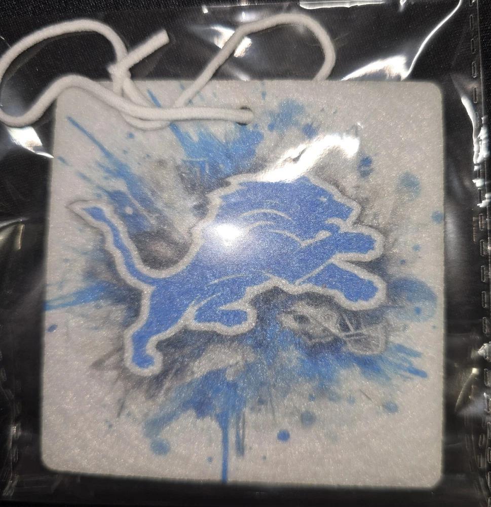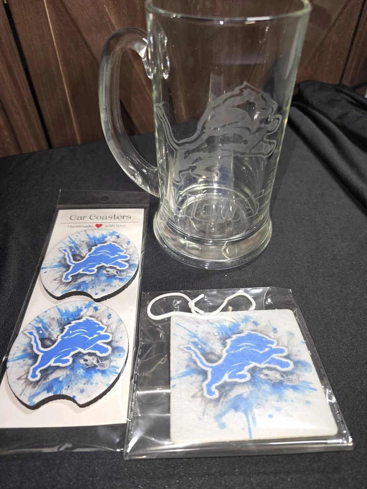 This Detroit Lions Gift Set includes a handmade mug featuring an etched lion design, perfect for any NFL fan. The set also includes reusable air freshener, car coasters, all decorated with the Lions theme. The mug is dishwasher safe and features a handle for easy use. This set is a great addition to any home bar or kitchen, and is ideal for Lions fans looking to show their team pride in style.