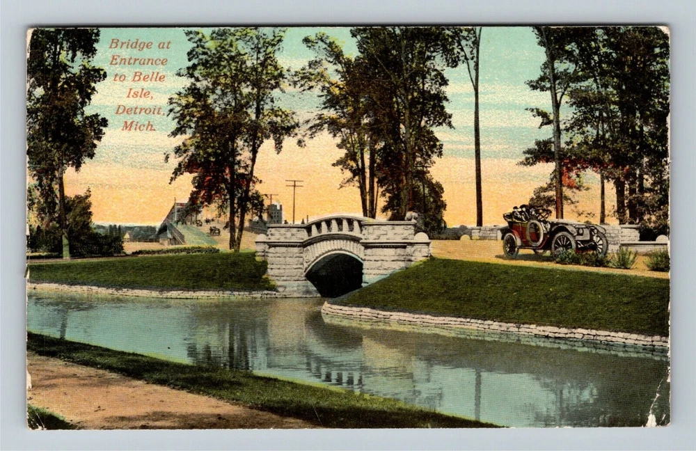 Detroit MI-Michigan, Belle Isle Entrance Bridge, Period Car Vintage Postcard