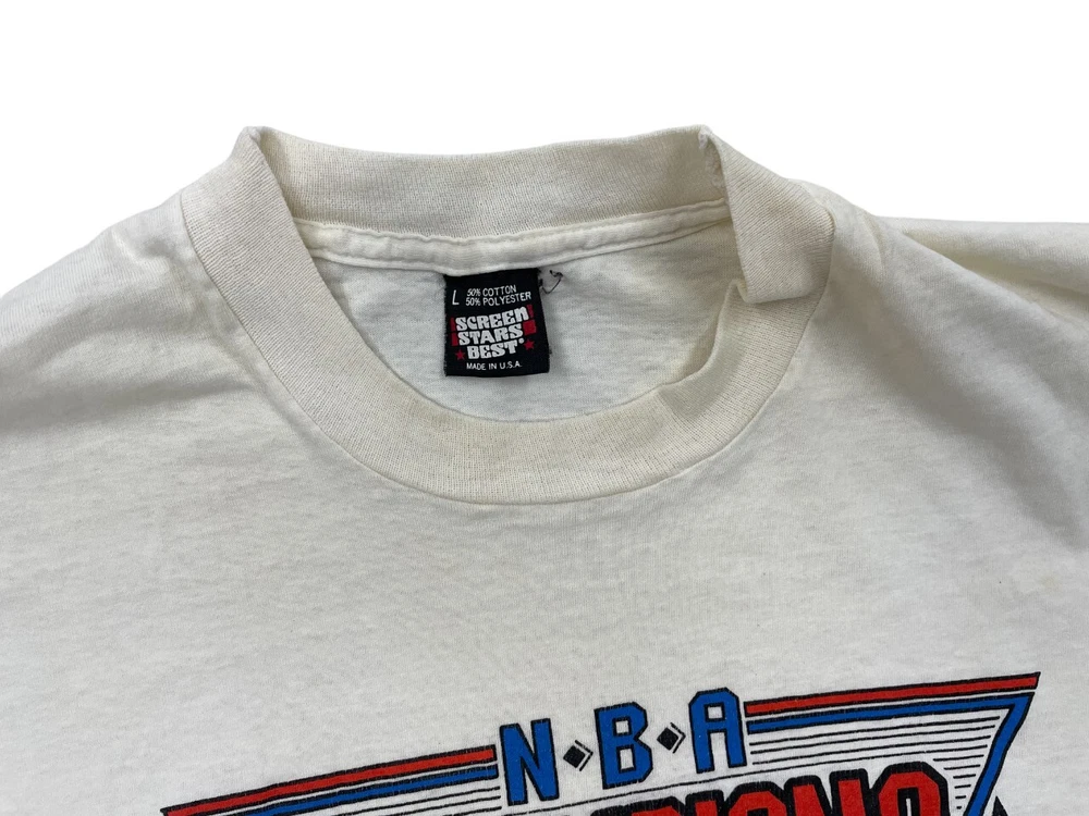 Fit: Regular Graphic Print: Yes Pattern: Print Neckline: Crew Neck Brand: Screen Stars Sleeve Length: Short Sleeve Department: Men Size Type: Regular Type: T-Shirt Size: L Theme: NBA, Vintage Vintage: Yes Color: White Material: Cotton, Polyester