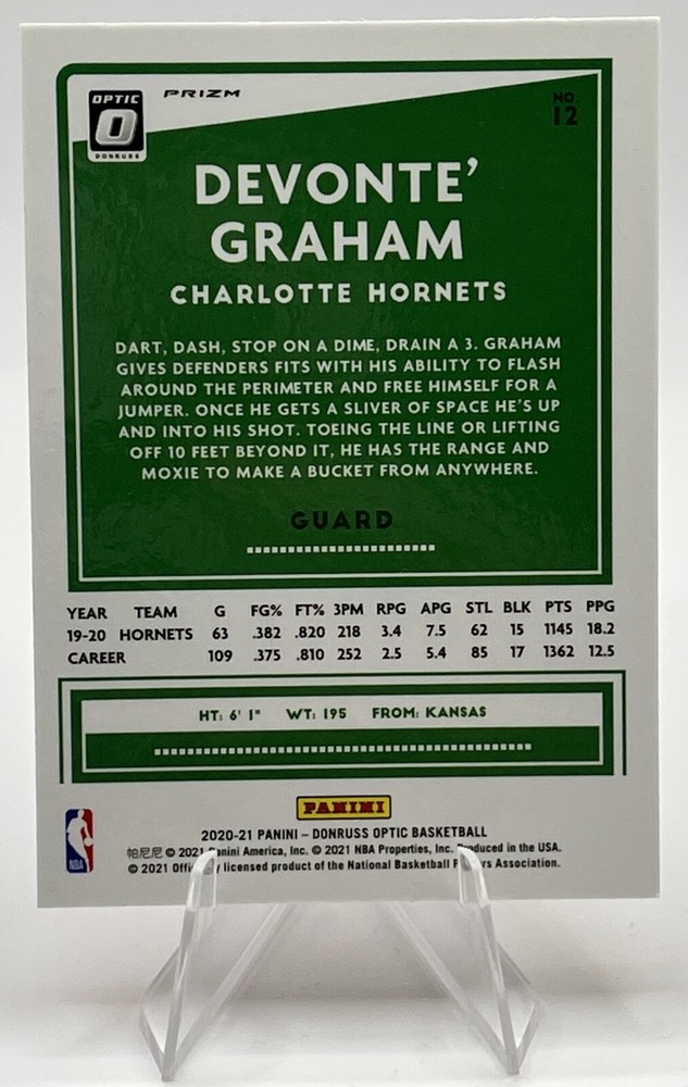 This is a 2020-21 Panini Donruss Optic trading card featuring Devonte' Graham of the Charlotte Hornets. The card is a Hyper Pink Prizm parallel from the Base Set, card number 12. It is part of the National Basketball Association (NBA) series and manufactured by Panini.