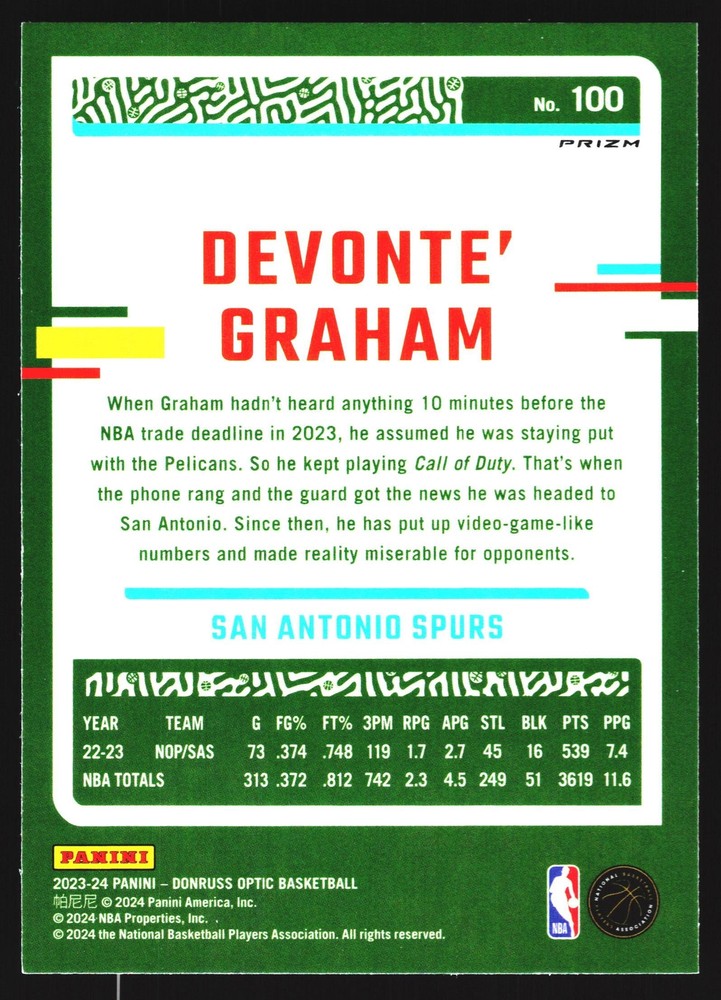 You will receive a Near Mint or Better, Devonte' Graham, 2023-24 Donruss Optic, SILVER HOLO, 100 San Antonio Spurs card PLEASE NOTE: SOME CARDS THAT GO THROUGH OUR SCANNER MAY APPEAR TO HAVE LINES THROUGH THEM. THEY ARE NOT ACTUAL SCRATCHES, SIMPLY FALSE IMAGE LINES. WE WILL NOT INTENTIALLY SELL, DAMAGED CARDS. NEW CARDS LISTED DAILY ORDERS SHIP NEXT DA Y (Weekends as mail service is available) VISIT OUR STORE FOR MORE DEALS! USE THE SEARCH ICON IN THE STORE TO FIND YOUR FAVORITE TEAMS & PLAYERS! Be sure to save us as sellers to be the first to be notified when new and exciting cards are posted! Please note, we are not professional graders, and the condition of the card you purchased is highly subjective. Please refer to the high quality scans of the card you are viewing, and determine the condition of the card for yourself. Feel free to reach out with questions! All cards are in EX-NM+ condition, unless stated otherwise Chrome cards from various brands might have minor light surface scratches, which is typical with these type of cards. Any major, deep scratches or major surface issues will be noted, if present. We take pride in the condition of all of our cards, including commons. Our promise to you, is that we will not sell a card we would not buy ourselves. Of course things slip by, however customer service is our #1 Priority, and we are always here for a message for ANY, and ALL issues. Thank you very much for stopping by, feel free to reach out! - Titan (Son) & Andy (Dad)